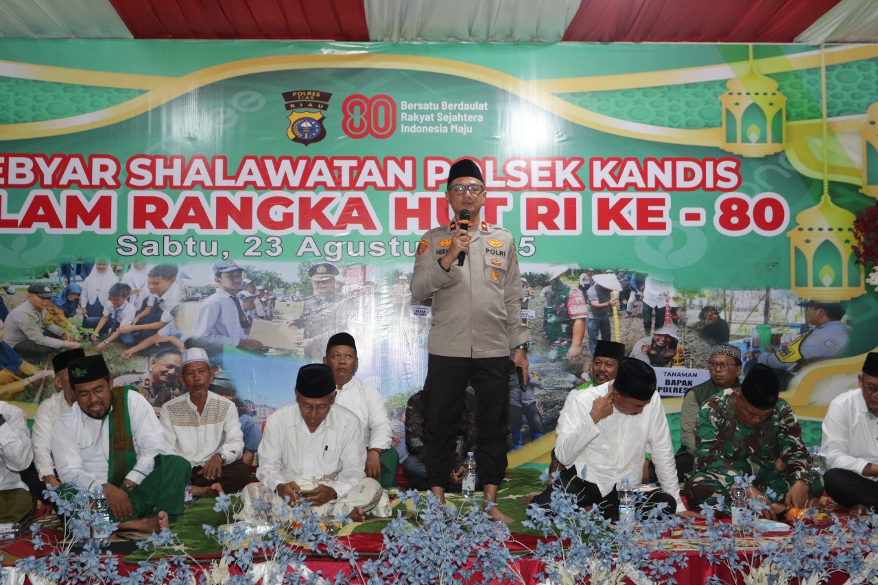 Kapolsek Kandis Kompol H. Herman Pelani,S.H.,M.H. dalam sambutannya menyampaikan rasa syukur atas terselenggaranya kegiatan ini sekaligus sebagai ajang silaturahmi bersama masyarakat. “Kegiatan Gebyar Sholawat ini bukan hanya dalam rangka memeriahkan HUT RI ke-80, tetapi juga sebagai wujud kebersamaan dan penguatan iman serta ukhuwah antara Polri dengan masyarakat Kandis,” ujarnya.