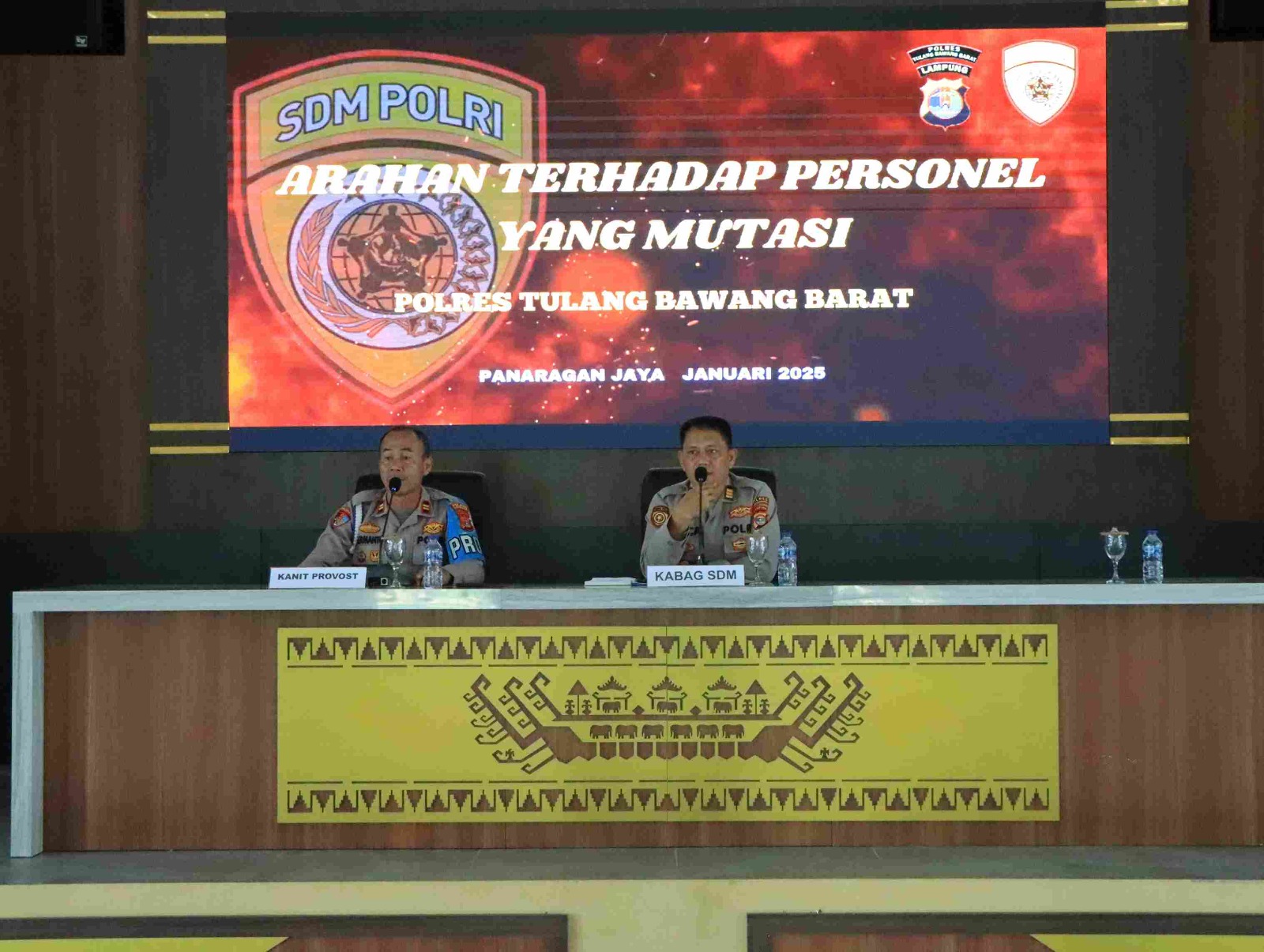 Tulang Bawang Barat,Kompas86.Com Kabag Sdm Polres Tulang Bawang Barat Akp A.Pancarudin, S.H., M.M, Di dampingi Kanit Provos Sipropam Polres Tulang Bawang Barat Iptu Hermanto memberikan arahan kepada 29 personil yang terkena mutasi sesuai dengan surat telegram Kapolres Tubaba ST/01/01/Kep 2025 Tanggal 03-01-2025 di Aula Sarya Arya Racana Mapolres Tubaba, Senin (06/01/2025) Pagi