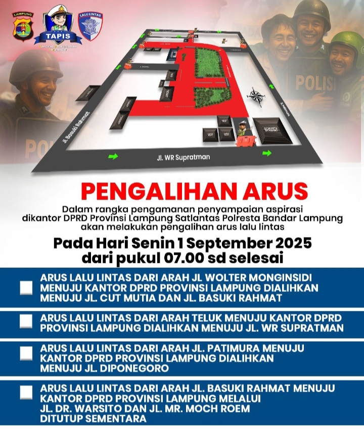 Lampung–Kompas86.com Satuan Lalu Lintas (Satlantas) Polresta Bandar Lampung akan memberlakukan pengalihan arus lalu lintas pada Senin (1/9/2025) mulai pukul 07.00 WIB hingga selesai. Langkah ini dilakukan untuk mendukung kelancaran dan keamanan penyampaian aspirasi di Kantor DPRD Provinsi Lampung.