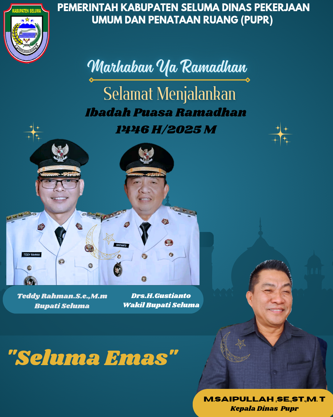 Oleh karena itu Kepala Dinas PUPR kabupaten Seluma M.Saipullah, menyampaikan atas nama keluarga besar Pupr.Selamat menunaikan ibadah puasa Ramadhan 2025,semogah Allah Swt memberikan kekuatan dan keberkahan setiap langkah kita,ungkanya pada jumat (7/03/2025).