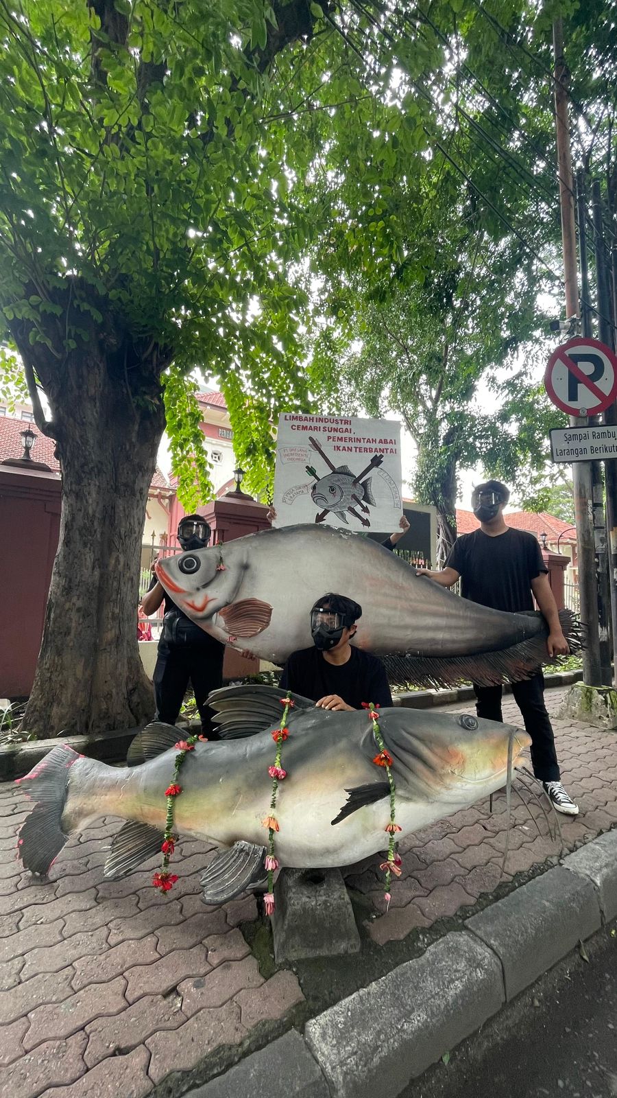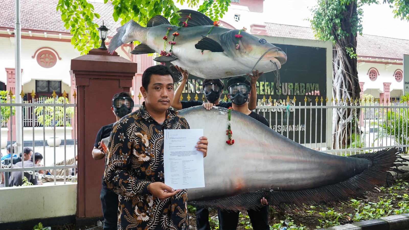Surabaya |Jatim | Komunitas Penyayang Ikan Perairan Nusantara (KOPIPA) Menggotong 2 replika ikan berukuran 2 meter didepan Pengadilan Negeri Surabaya di Jalan Arjuno.