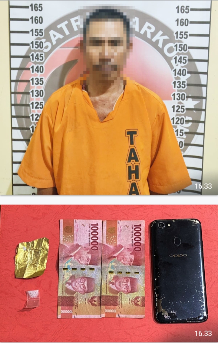 Pria paruh baya yang ditangkap oleh petugas dari Satresnarkoba Polres Tulang Bawang dalam kegiatan ‘Gasak Narkoba’ berinisial SA (51), berprofesi wiraswasta, warga Kampung Suka Bhakti, Kecamatan Gedung Aji Baru, Kabupaten Tulang Bawang.