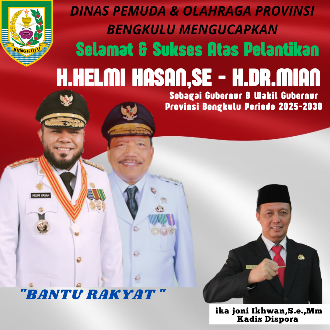 Atas nama keluarga besar Dinas Pemuda & Olahraga mengucapakan selamat atas pelantikan bapak H.Helmi Hasan,S.e dan bapak Dr.Mian sebagai Gubernur – Wakil Gubernur Bengkulu periode 2025-2030.