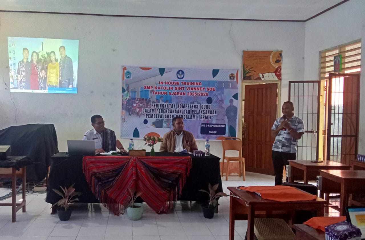 Nusa Tenggara Timur-Kompas86.com Bertempat di SMP Katolik Sint Vianney Soe, Kabupaten Timor Tengah Selatan, Provinsi Nusa Tenggara Timur, Rabu, 3-4 September 2025, kepala SMP Katolik Sint Vianney Soe, Pastor Johannes A Tnomel, Pr bersama para guru mengadakan kegiatan In House Training ( IHT ) dengan tema” Peningkatan Kompetensi Guru Dalam Perencanaan Dan Pelaksanaan Pembelajaran Mendalam ( RPM ).