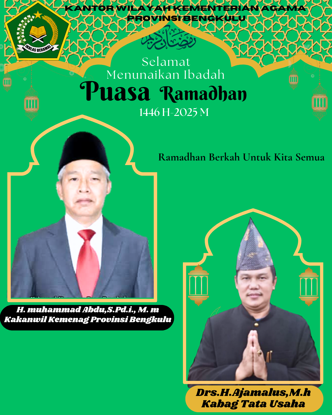 Kepala Kantor Kementerian Agama Provinsi Bengkulu beserta jajarannya mari bersama menjalankan ibadah puasa bagi umat muslim dibulan Ramadhan 1446 Hijriah.