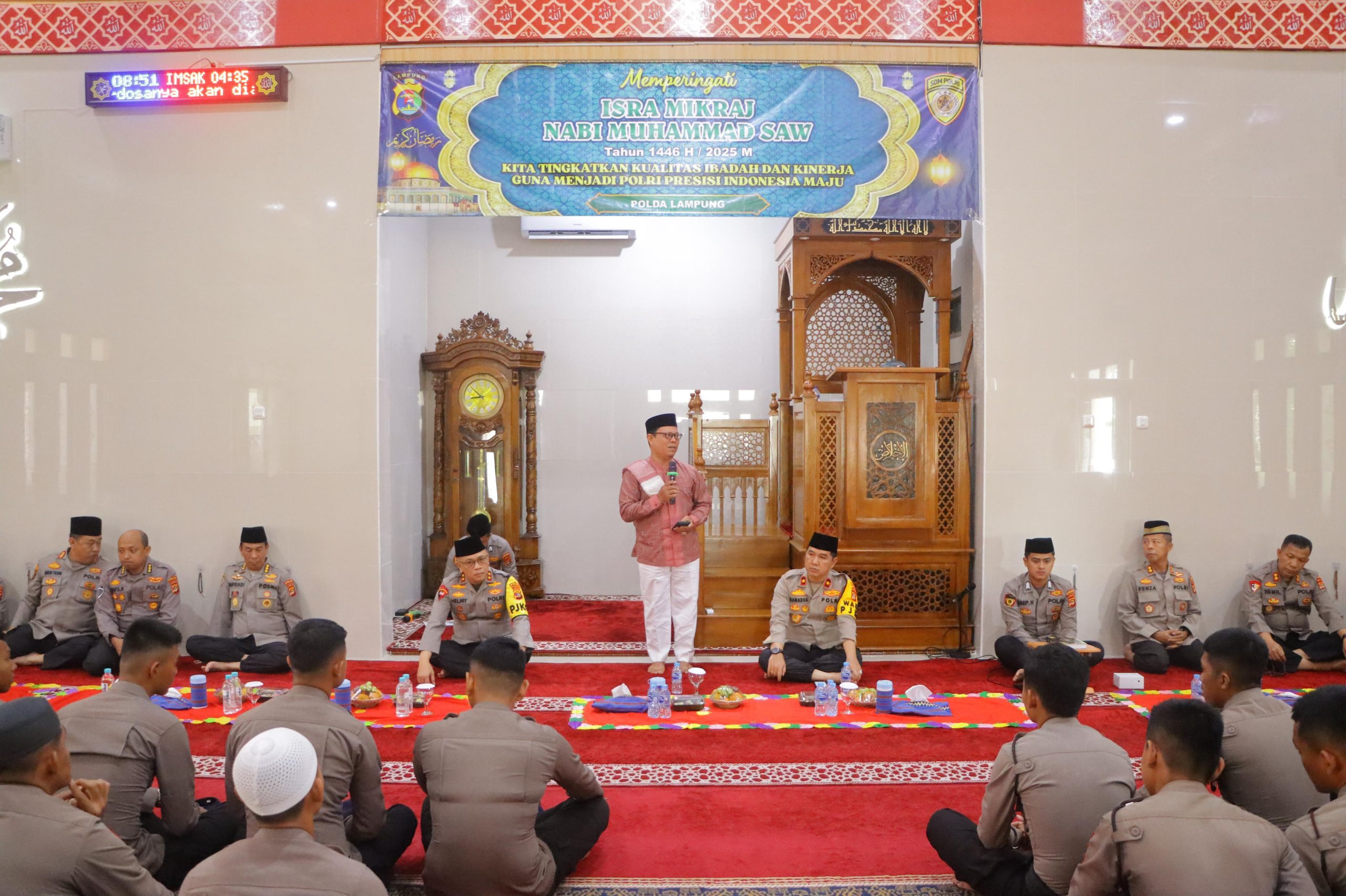 Dalam sambutannya, Kapolda Lampung Irjen Pol Helmy Santika menyampaikan bahwa peringatan Isra Mikraj mengingatkan seluruh personel tentang pentingnya ibadah sebagai landasan hidup.