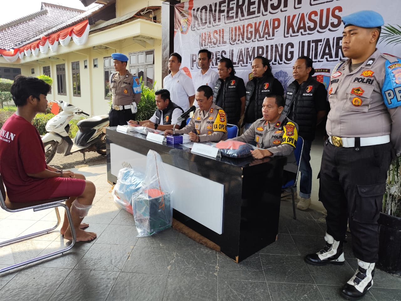 Kapolres Lampung Utara AKBP Deddy Kurniawan didampingi Waka Polres Kompol Yohanis dan Kasat Reskrim AKP Apfryyadi dalam Konferensi Pers di Halaman Mapolres, Senin (11/8/2025), mengatakan Tekab 308 Polda Lampung yang diback up Ditreskrimum Polda Lampung berhasil mengungkap kasus pembunuhan yg diawali pemerkosaan dan pencurian dengan kekerasan terhadap seorang karyawati warung sate di Desa Negara Tulang Bawang.