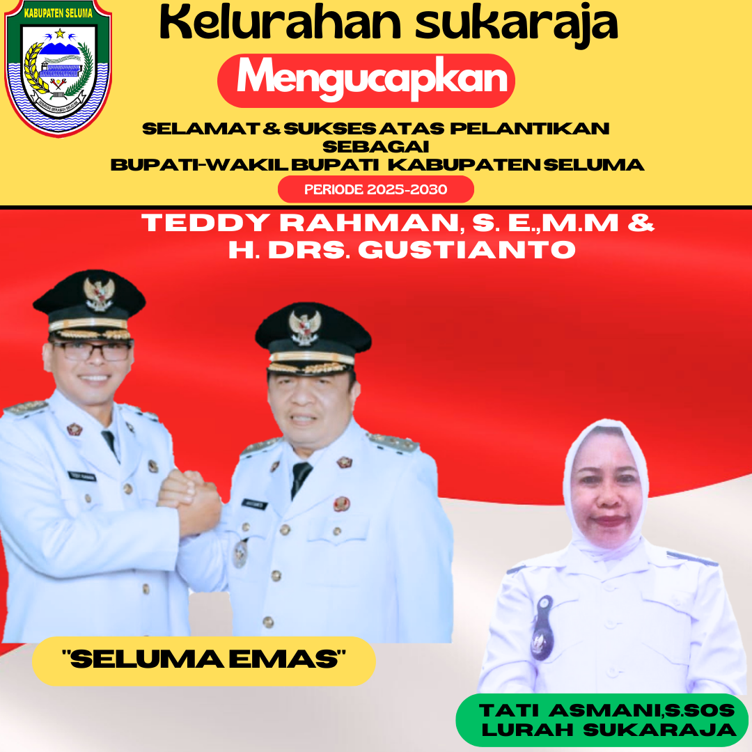 Atas nama seluru Asn Kelurahan Sukaraja mengucapakan selamat atas pelantikan Bapak Teddy Rahman,S.e.,M.m dan Bapak H.Drs.Gustinto sebagai Bupati- Wakil Bupati Kabupaten Seluma periode 2025-2030.