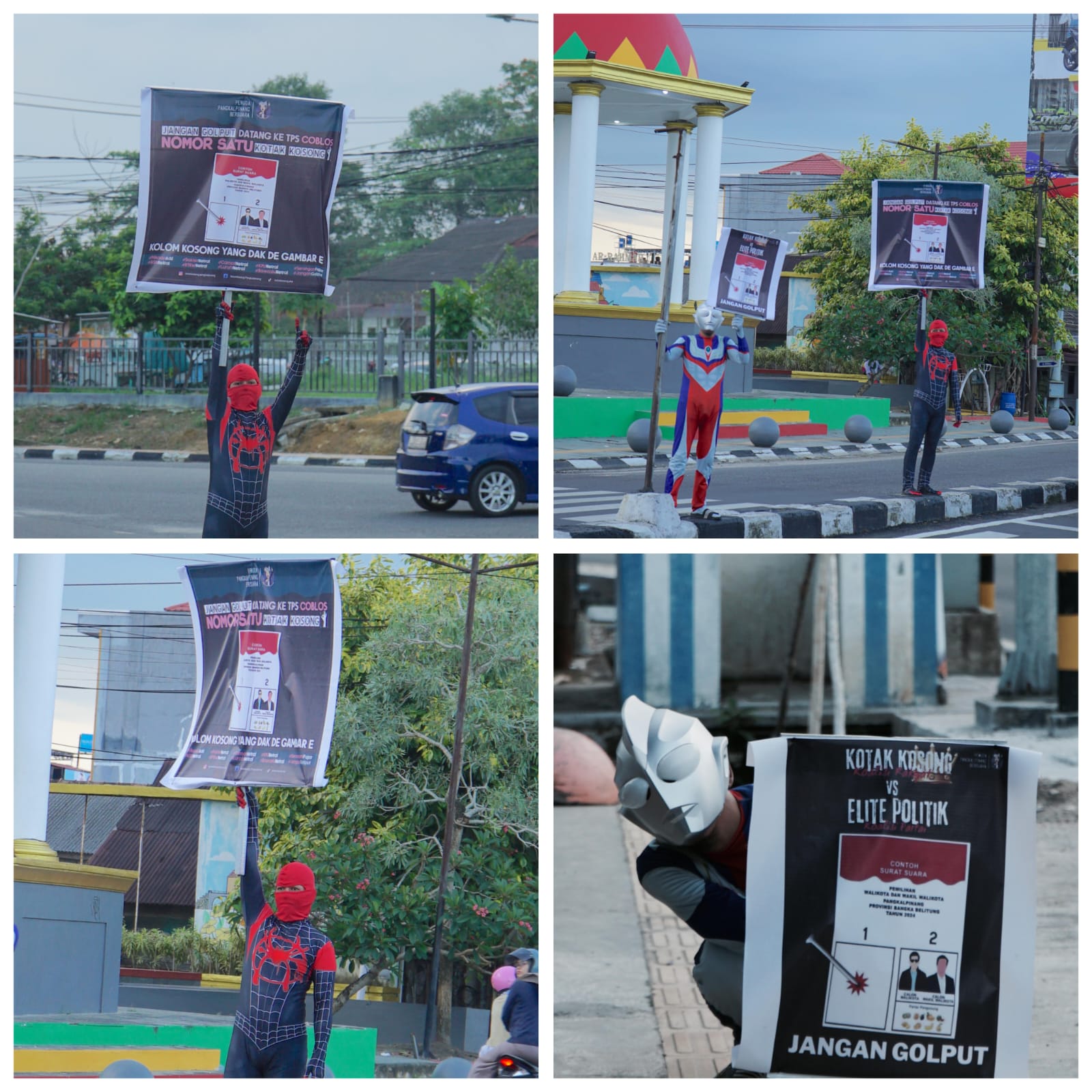PANGKALPINANG — Kreativitas dan semangat pemuda di Pangkalpinang semakin terasa melalui inisiatif sosialisasi kotak kosong yang diusung oleh kelompok Pemuda Pangkalpinang Bersuara. Pada Selasa (15/10/2024), di simpang tujuh DKT, para anggota kelompok ini menarik perhatian masyarakat dengan mengenakan kostum tokoh superhero, seperti Spiderman dan Ultraman, sambil mengangkat poster-poster yang menjelaskan konsep kotak kosong.
