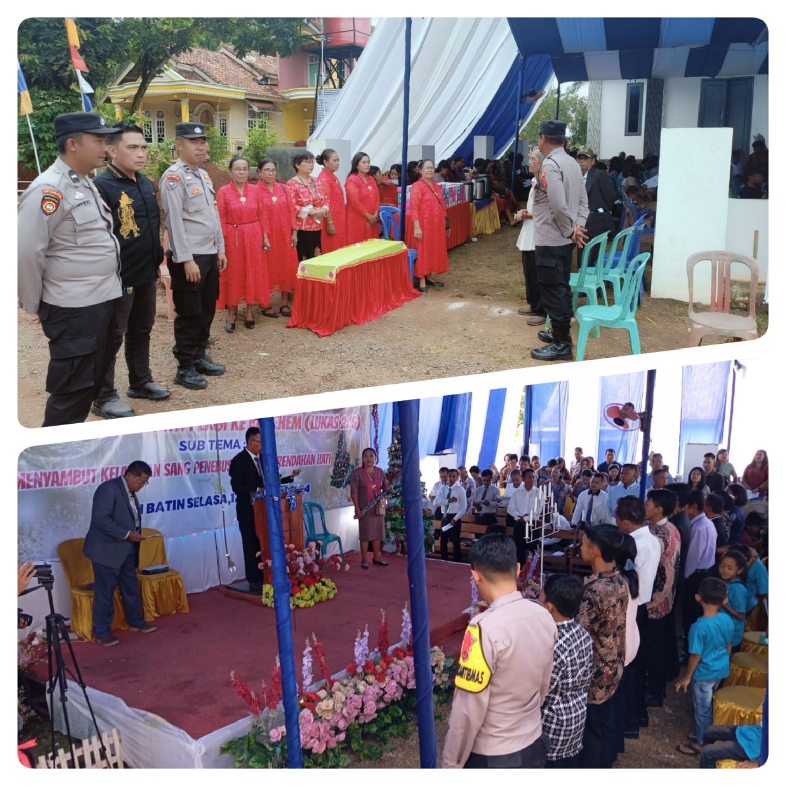 Polsek Blambangan Umpu Polres Way Kanan melaksanakan pengamanan ibadah umat Nasrani yang merayakan Natal tahun 2024 di halaman GKSBS Kampung Negeri Batin Kecamatan Umpu Semenguk Kabupaten Way Kanan. Rabu (18/12/2024).