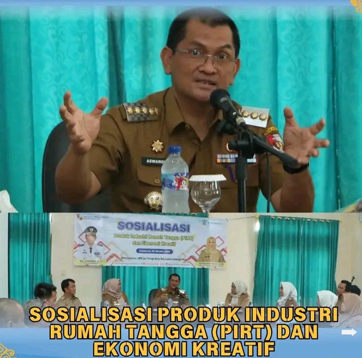 Lampung Utara,Kompas86.Com Pj.Bupati Lampung Utara, Drs. H. Aswarodi, M.Si., didampingi Kepala Dinas Koperasi, UKM, dan Tenaga Kerja, Tien Rostina, SH., MM., menghadiri dan membuka acara Sosialisasi Produk Industri Rumah Tangga (PIRT) dan Ekonomi Kreatif yang diselenggarakan di Aula PKK Kabupaten Lampung Utara, Selasa, 29 Oktober 2024.