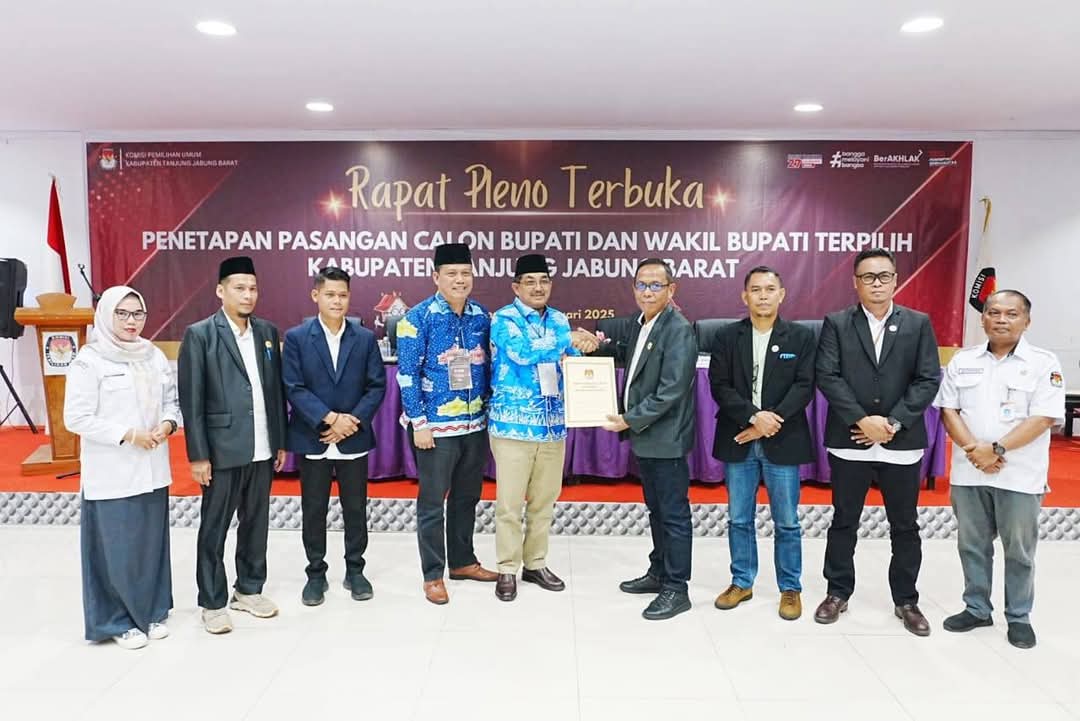 Pasangan tersebut resmi terpilih setelah memperoleh suara terbanyak pada Pemilihan Serentak Tahun 2024 dan akan memimpin Kabupaten Tanjung Jabung Barat untuk periode mendatang.