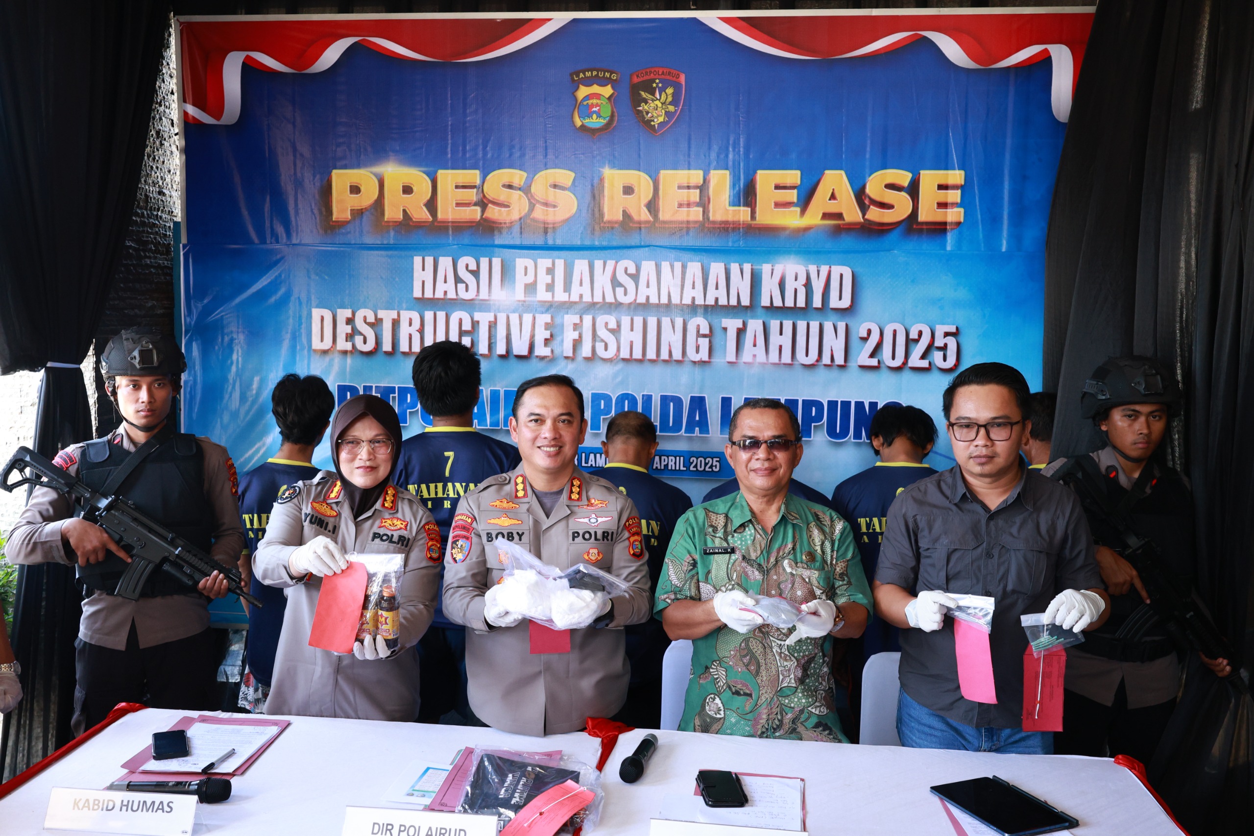 Bandar Lampung,Kompas86.Com Selama periode tiga bulan terakhir, Direktorat Polisi Perairan dan Udara (Polairud) Polda Lampung berhasil mengungkap 7 kasus penangkapan ikan ilegal yang dilakukan dengan metode merusak (destructive fishing) di wilayah perairan Lampung. Penindakan berlangsung sejak 24 Februari hingga 24 April 2025 dan mengamankan sejumlah pelaku dari berbagai daerah.