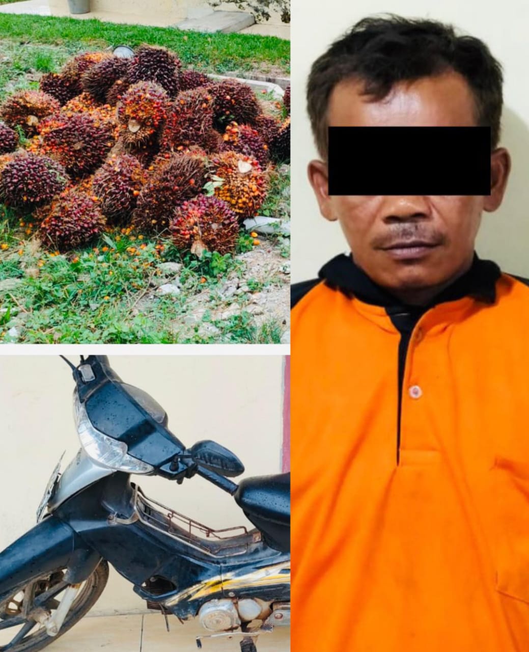 “Tersangka kami amankan usai melakukan pencurian buah kelapa sawit milik perusahaan. Petugas keamanan yang berpatroli mencurigai adanya aktivitas mencurigakan di lokasi kejadian. Setelah dilakukan pengawasan sejak subuh hingga pagi hari, tersangka terlihat tengah mengumpulkan tandan buah kelapa sawit dan menutupinya dengan pelepah sawit,” kata Kapolsek.
