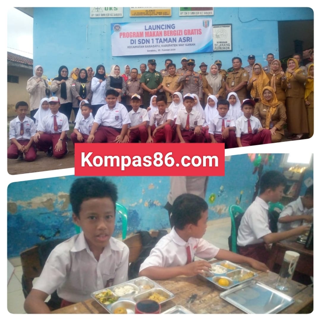 Way kanan,Kompas86.com Pelita prabu DPC Way Kanan dibawah Yayasan prabu center 08,Runing perdana Program Makan Bergizi Gratis (MBG) di SDN 01 Taman Asri dan sekolah sekolah lainnya yang ada di Kecamatan Baradatu Kabupaten Way Kanan provinsi Lampung, Selasa (25/02/2025)