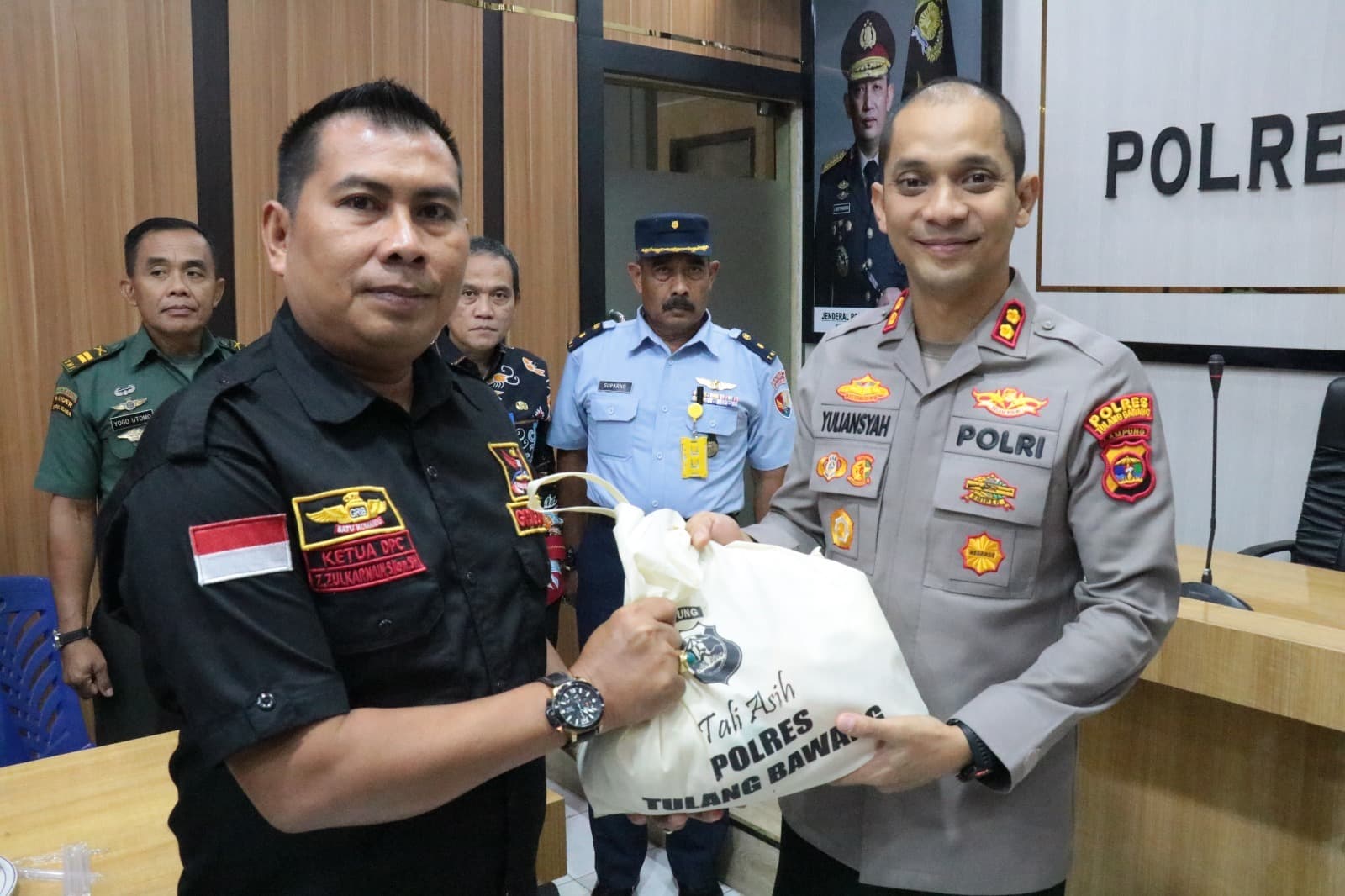 1. Yayasan Yazid Berlian Islam di Kampung Tiuh Tohou, Kecamatan Menggala, Kabupaten Tulang Bawang, dilaksanakan baksos sebanyak 65 (enam puluh lima) paket sembako oleh Polres Tulang Bawang bersama PMII Tulang Bawang.