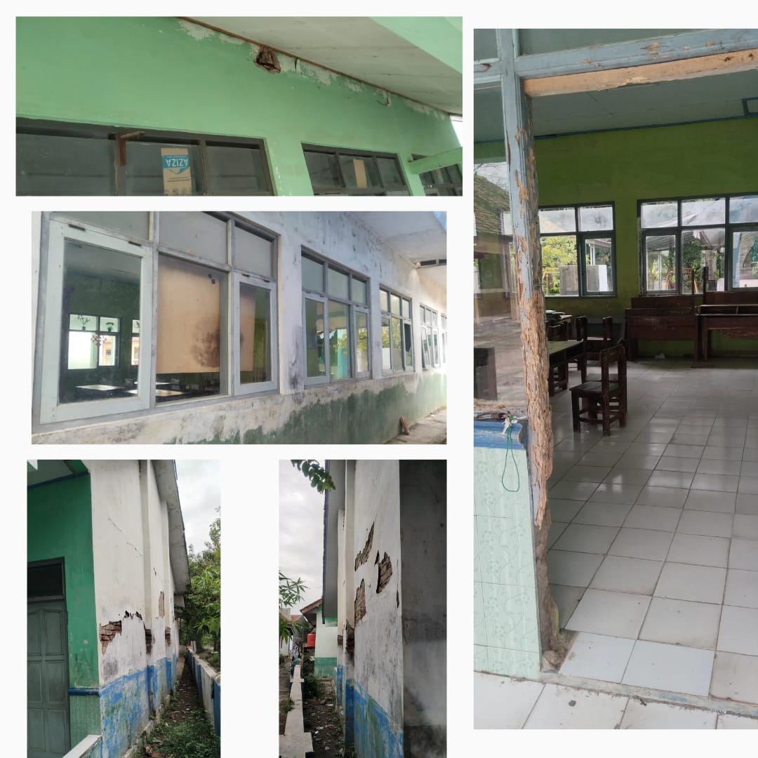 Terlihat bagian dinding sudah ada yang terbelah dikhawatirkan dapat berpotensi roboh serta kondisi kusen jendela dan pintu serta bagian atap yang sudah terlihat rapuh.