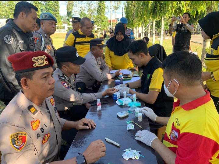 Pemeriksaan berupa pengecekan tekanan darah, gula darah, kolestrol, asam urat dan pemberian obat yang berlangsung di lapangan Mapolres.