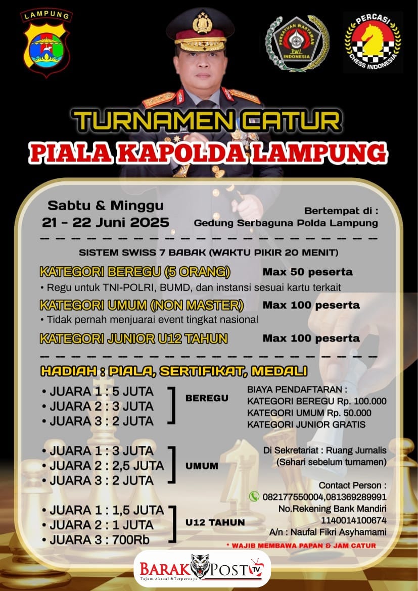 Lampung,Kompas86.com Turnamen Catur Piala Kapolda Lampung pendaftaran mulai dibuka hari ini 10-19 Juni yang akan digelar di GSG Presisi Polda Lampung.