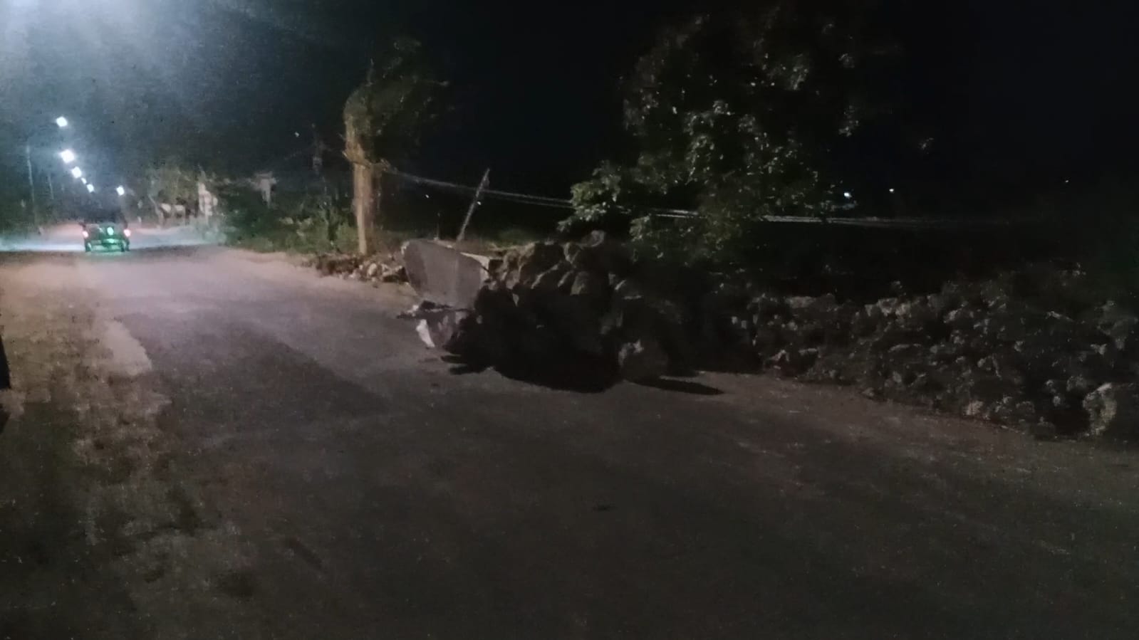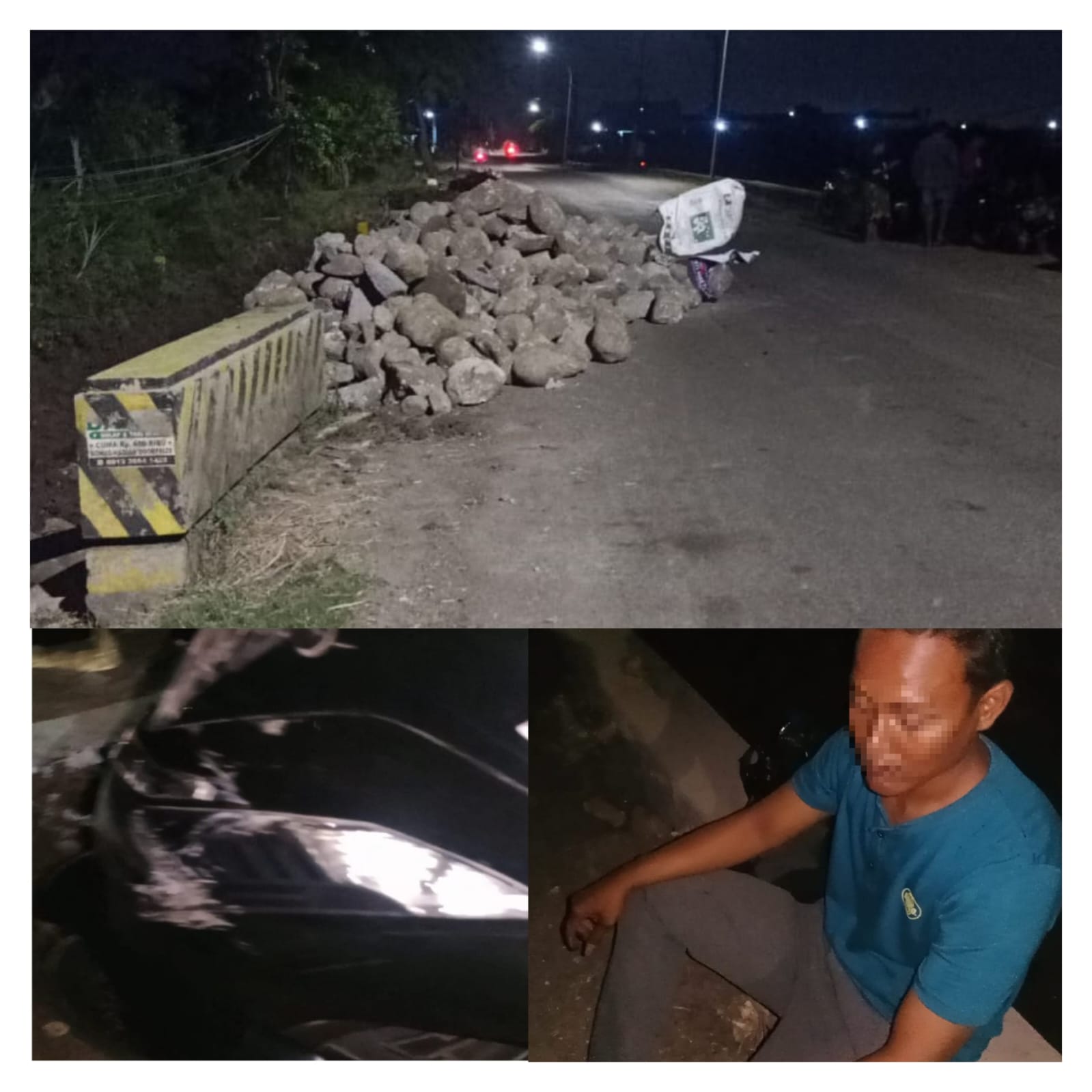 “Betul, batu-batu dari pengirim material yang diduga bongkar sembarangan dibiarkan di tengah jalan. Saat lampu jalan juga mati, jadi tidak kelihatan sama sekali. Rambunya tidak ada, hanya karung bekas yang dipasang di pinggir,” ujarnya.