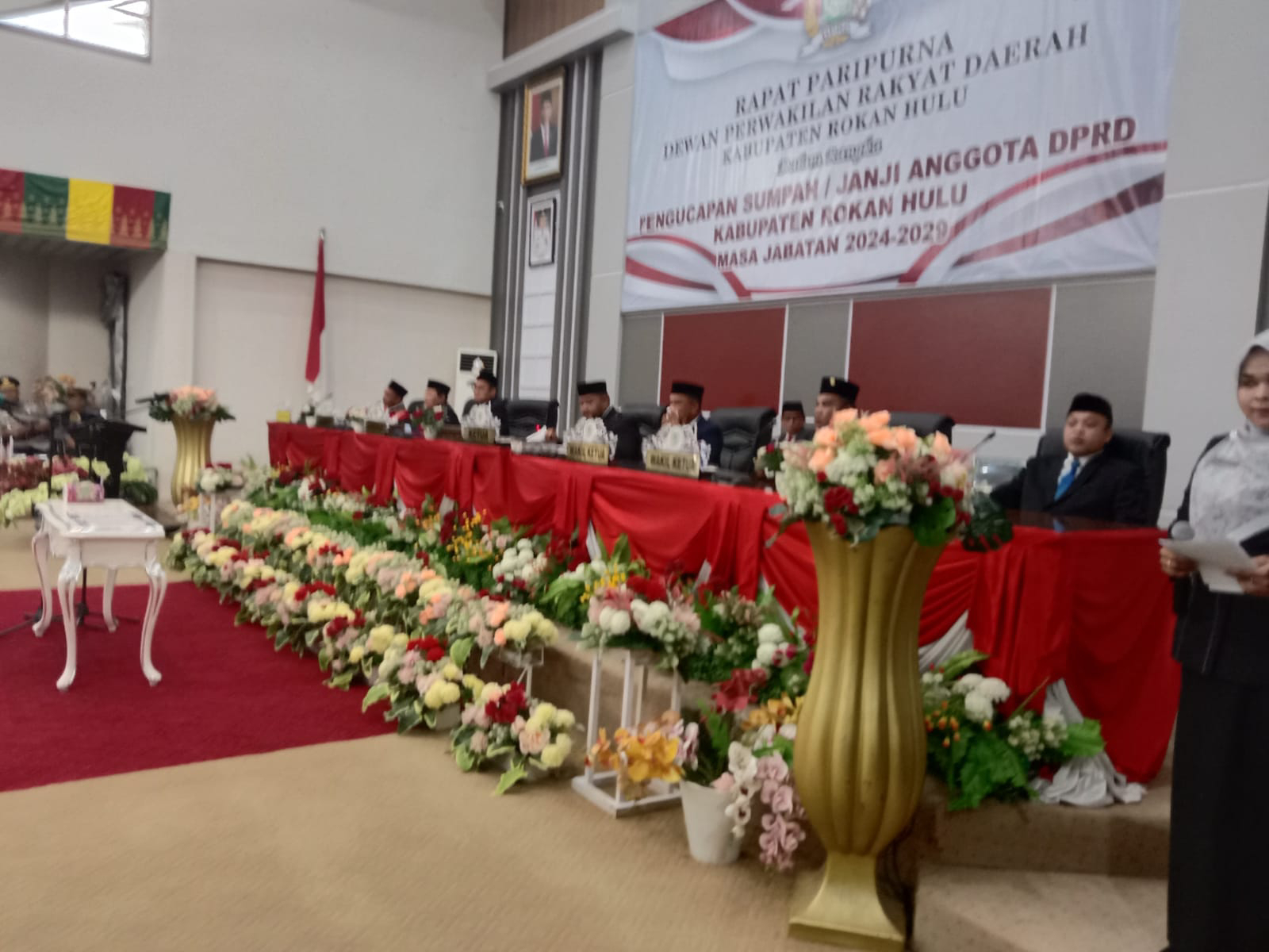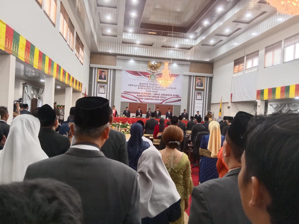 Setelah dibuka oleh Ketua DPRD Kabupaten Rokan Hulu, prosesi pelantikan sumpah/janji jabatan dilanjutkan dengan pembacaan Surat Keputusan (SK) Gubernur Riau oleh Sekretaris DPRD Kabupaten Rokan Hulu, H. Sariaman. Pengambilan sumpah/janji dipandu oleh Ketua Pengadilan Negeri Pasirpengaraian, Rony Suata, S.H.,M.H., dan diikuti oleh seluruh anggota DPRD periode 2024-2029.