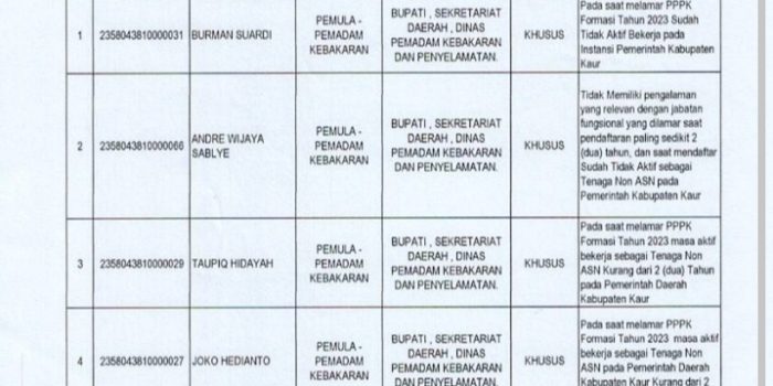 Kaur (Bengkulu)Kompas86.com/BKD -PSDM Kabupaten Kaur mengumumkan pembatalan kelulusan terhadap 6 orang tenaga teknis dan 1 orang tenaga kesehatan di Pegawai Pemerintah dengan Perjanjian Kerja (PPPK) melalui website kaur bkdpsdm@gmail.com. Pengumuman pembatalan ini Pada jabatan tenaga teknis dan jabatan tenaga kesehatan padahal mereka sebelumnya telah diumumkan lulus pada 23 Desember 2023 lalu.