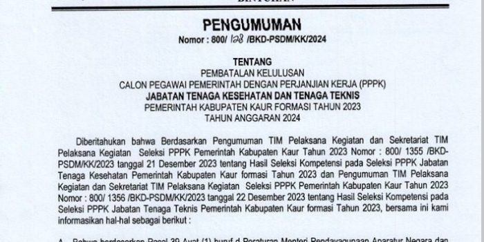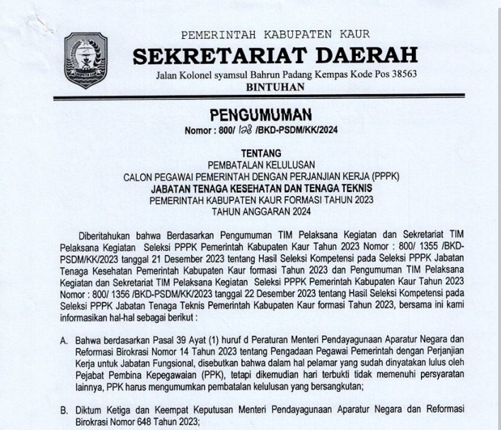 Pengumuman pembatalan tersebut bernomor: 800/128/BKD-PSDM/KK/2024, tentang revisi hasil akhir dan pembatalan kelulusan calon PPPK jabatan tenaga teknis dan tenaga kesehatan formasi 2023 Kabupaten Kaur. Pengumuman dikeluarkan pada 13 Febuari 2024 .