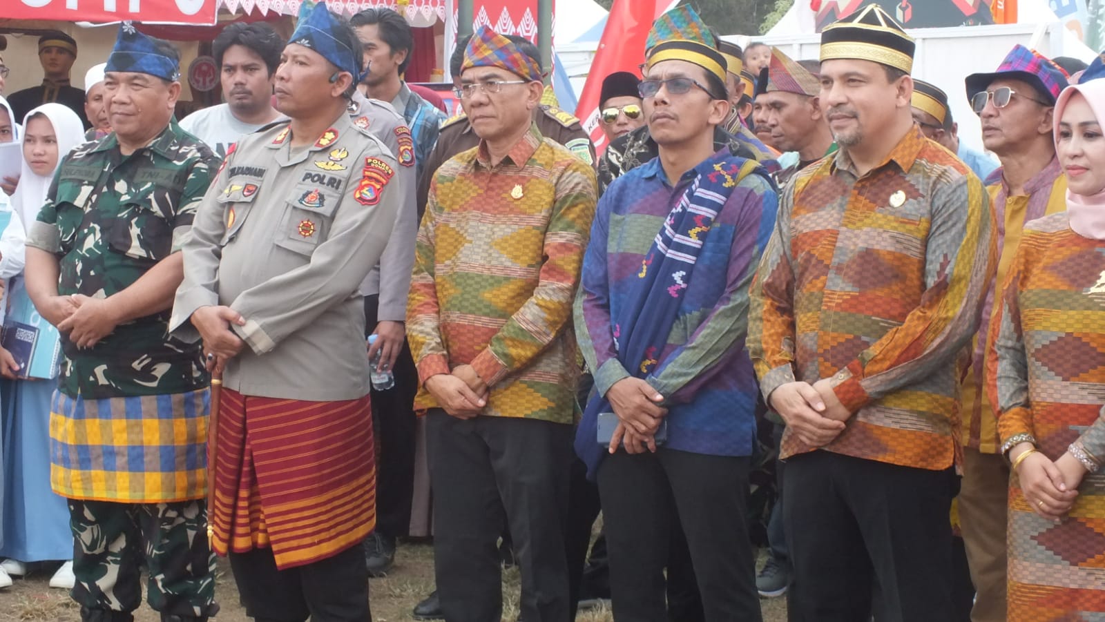 Selain itu ikut hadir pula seluruh Kepala OPD, pimpinan BUMN, pimpinan lembaga vertikal di Daerah dan Pejabat teras di lingkup Pemda Dompu yang lengkap menggunakan kostum Muna pa,a khas adat Dompu.