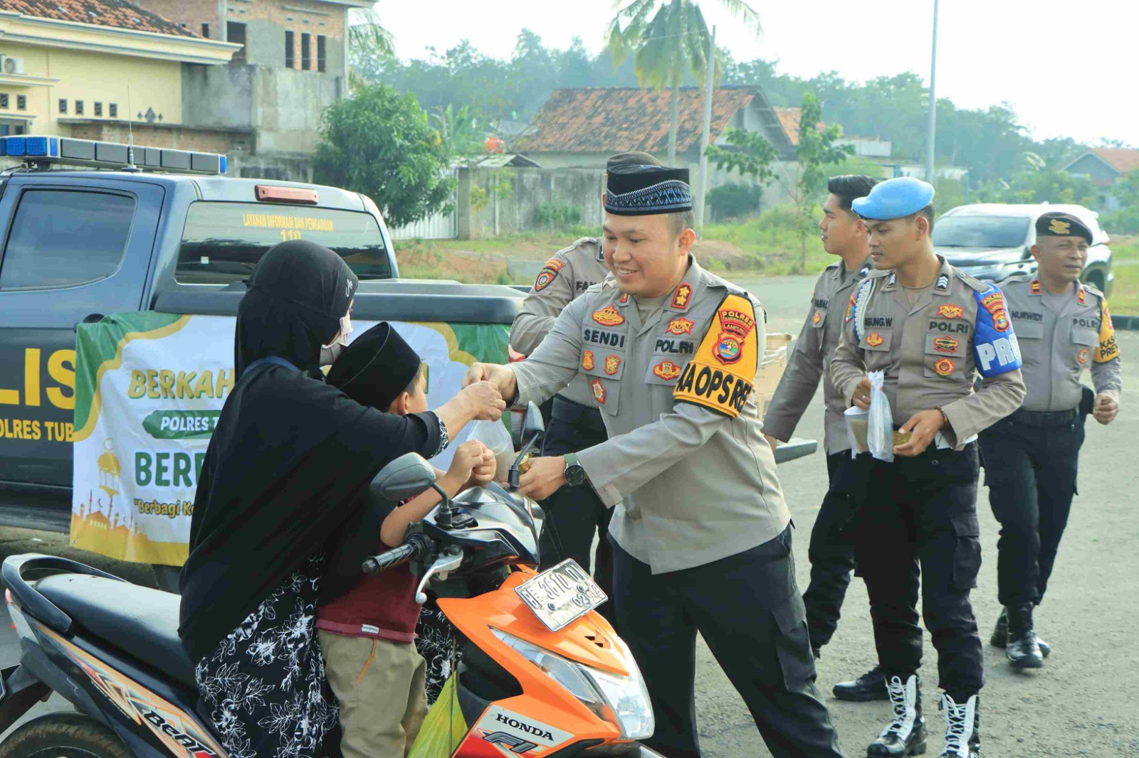 Terlihat Kapolres Tubaba beserta PJU dan Personil Polres Tubaba dengan antusias membagikan paket takjil kepada pengendara roda dua, roda empat, serta masyarakat sekitar yang melintas.