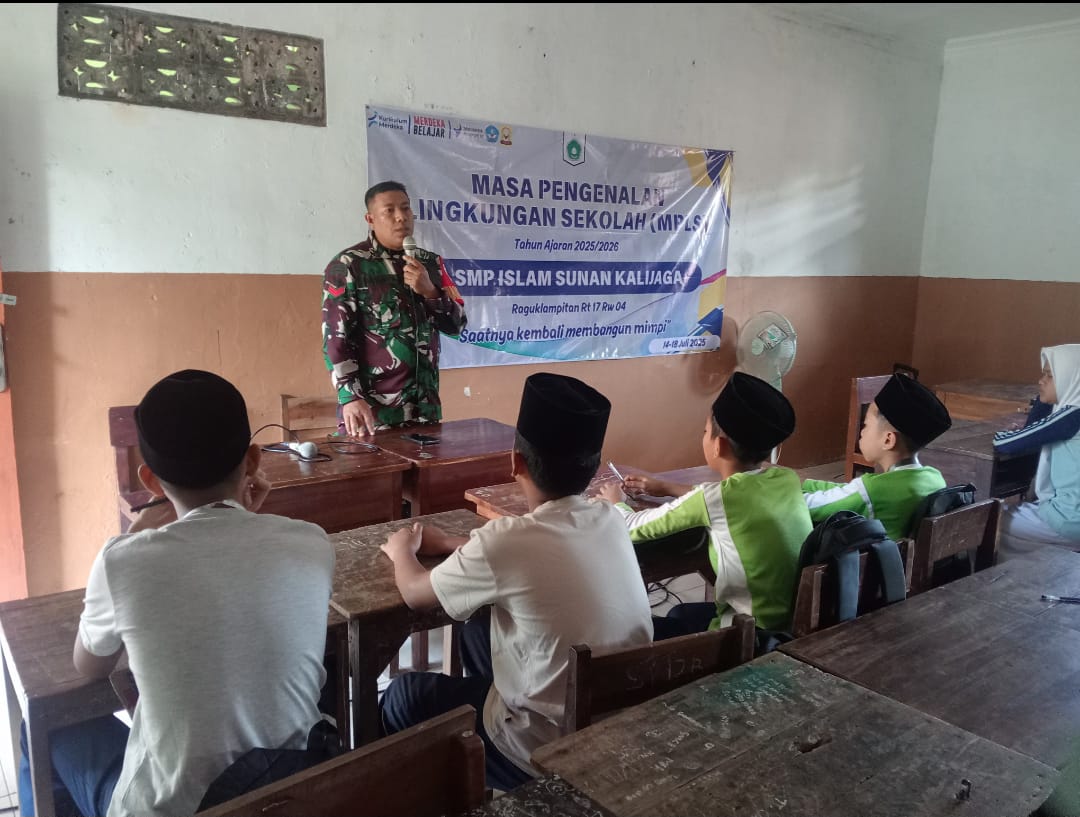 Jepara 17-7-2025– Dalam rangka Masa Pengenalan Lingkungan Sekolah (MPLS) tahun ajaran baru 2025/2026, Babinsa Desa Raguklampitan, Koramil 03/Batealit, Koptu Jumarno memberikan materi penyuluhan tentang bahaya dan pencegahan judi online (judol) kepada para siswa baru SMP Sunan Kalijaga, Desa Raguklampitan, Kecamatan Batealit, Kabupaten Jepara, Kamis (17/07/2025).