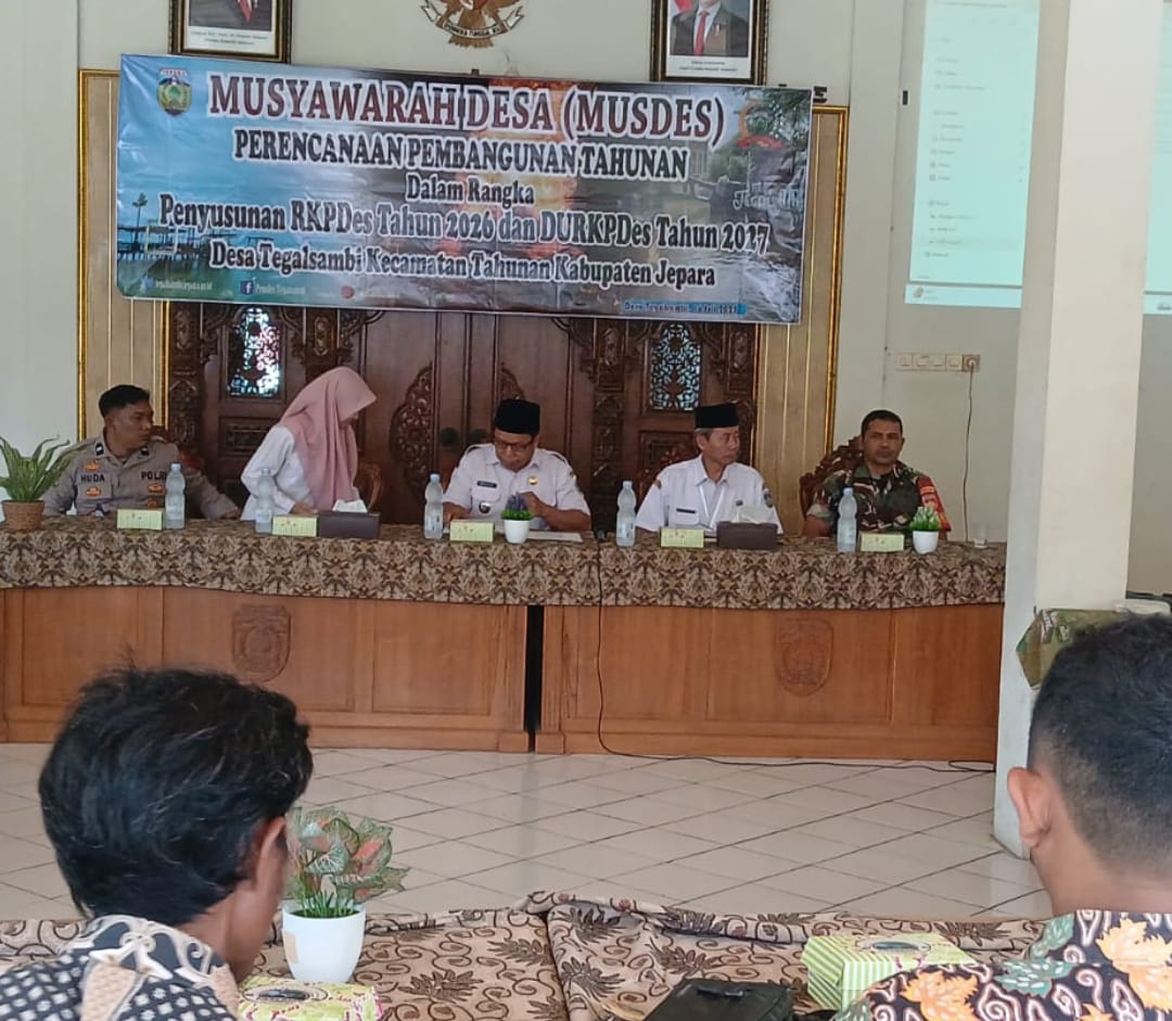 Jepara, 16 Juli 2025 — Babinsa Desa Tegalsambi, Koptu Hamdani, menghadiri kegiatan Musyawarah Desa (Musdes) Perencanaan Pembangunan Tahunan dalam rangka penyusunan Rencana Kerja Pemerintah Desa (RKPDes) Tahun 2026 dan Daftar Usulan RKPDes (DU-RKPDes) Tahun 2027. Kegiatan ini digelar di Balai Desa Tegalsambi, Kecamatan Tahunan, Kabupaten Jepara, dengan tujuan menampung aspirasi masyarakat serta merumuskan program prioritas pembangunan desa secara partisipatif dan terarah.