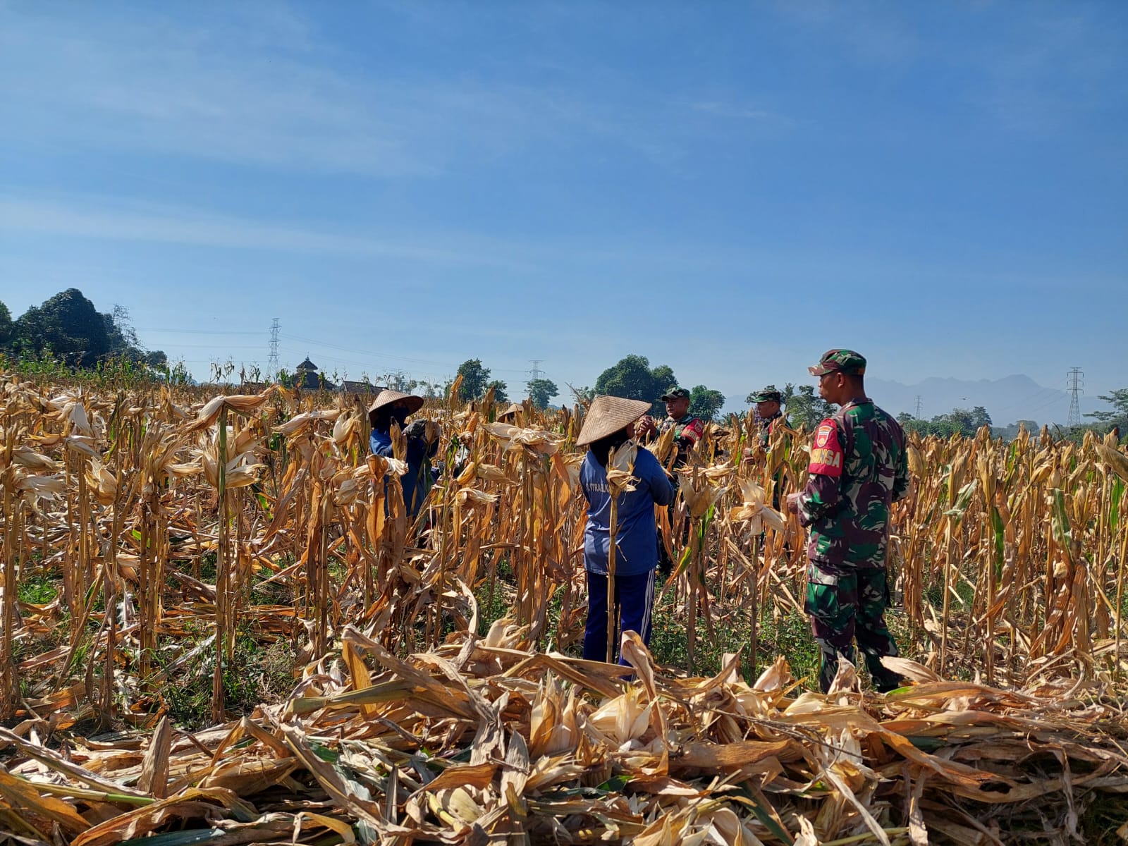 Jepara 31-7-2025– Wujud nyata dukungan TNI terhadap ketahanan pangan nasional kembali terlihat di wilayah Kabupaten Jepara. Anggota Koramil 07/Bangsri, khususnya Babinsa Desa Banjaragung, Sertu Haryono bersama dua anggota lainnya, Koptu Sugeng dan Koptu Suprianto, melaksanakan kegiatan membantu petani dalam panen jagung di lahan milik Bapak Sugianto, anggota Kelompok Tani (Poktan) Banjaragung II.
