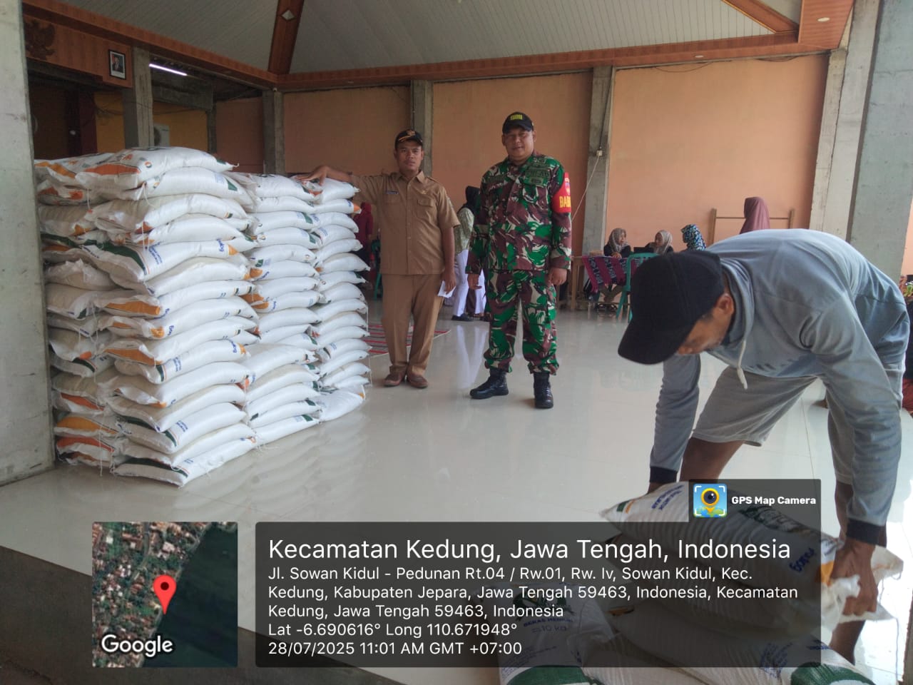 Jepara – Dalam rangka mendukung kelancaran program bantuan pangan dari pemerintah, Bintara Pembina Desa (Babinsa) Sowan Kidul, Kopral Kepala (Kopka) Kartiko yang merupakan anggota Koramil 02/Kedung, melaksanakan pemantauan pendistribusian bantuan pangan berupa beras kepada warga masyarakat. Kegiatan ini berlangsung di Balai Desa Sowan Kidul, Kecamatan Kedung, Kabupaten Jepara, Senin (28/7/2025).