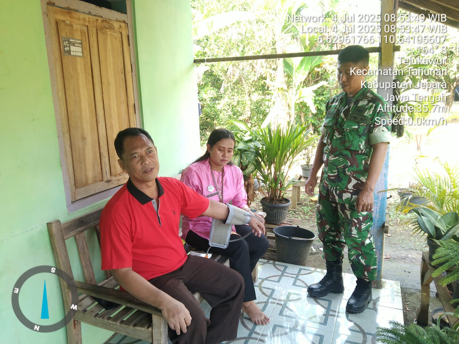 Jepara 4-7-2025– Babinsa Desa Telukawur, Pelda Eko Wahyu R, bersama Bidan Desa melaksanakan kegiatan komunikasi sosial (Komsos) sekaligus pengecekan kesehatan terhadap salah satu warga, Bapak Sugiyarno, warga RT 04/RW 01 Desa Telukawur, Kecamatan Tahunan, Kabupaten Jepara, pada hari Jumat [4/7].