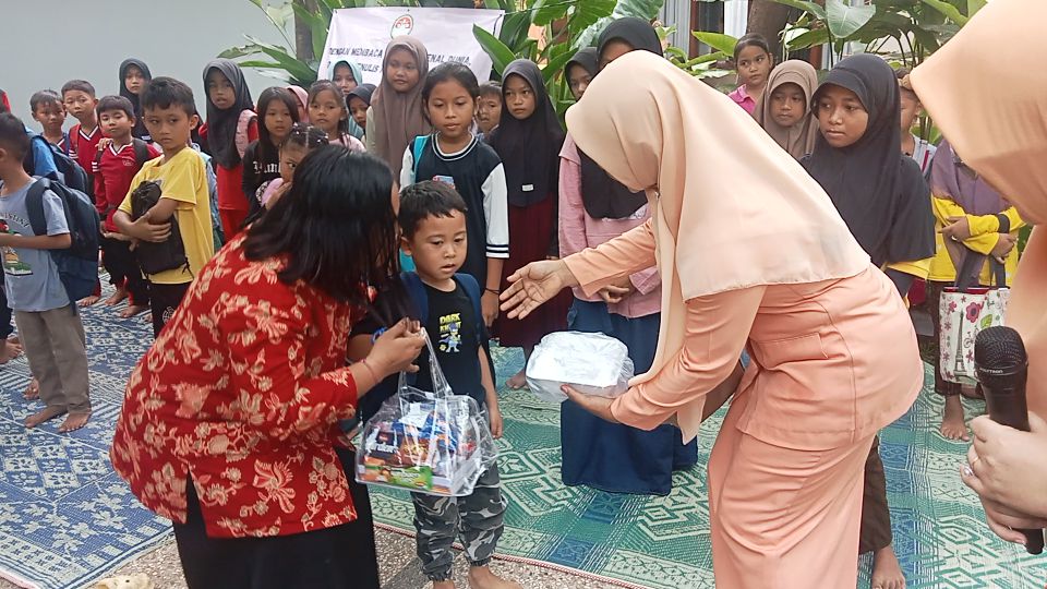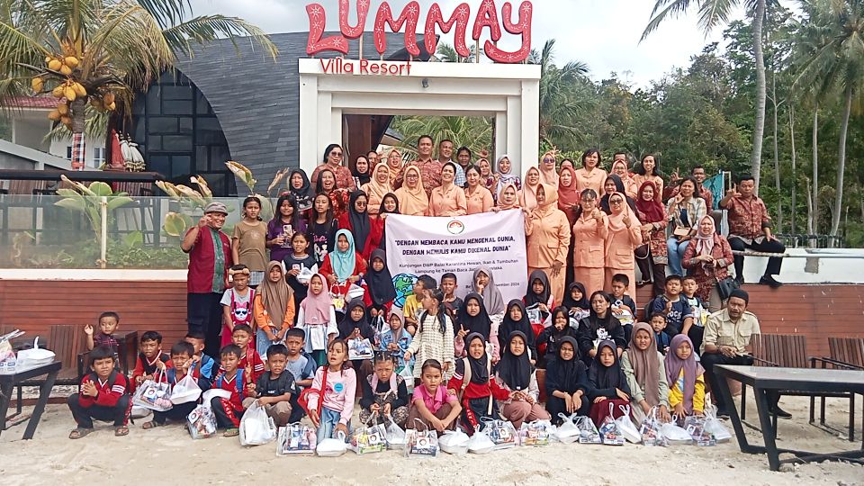 KOMPAS86.COM, Lampung Selatan – Rombongan Dharma Wanita, Badan Karantina Indonesia, Balai Karantina Hewan, Ikan, dan Tumbuhan Lampung mengunjungi taman belajar membaca (TBM) Jangkar Pustaka dan gelar bakti sosial donasikan alat tulis, buku serta makanan bergizi gratis di Lumaii resort Pantai Minang Rua Desa Kelawi Kecamatan Bakauheni Kabupaten Lampung Selatan. Jum’at, 06/12/2024.