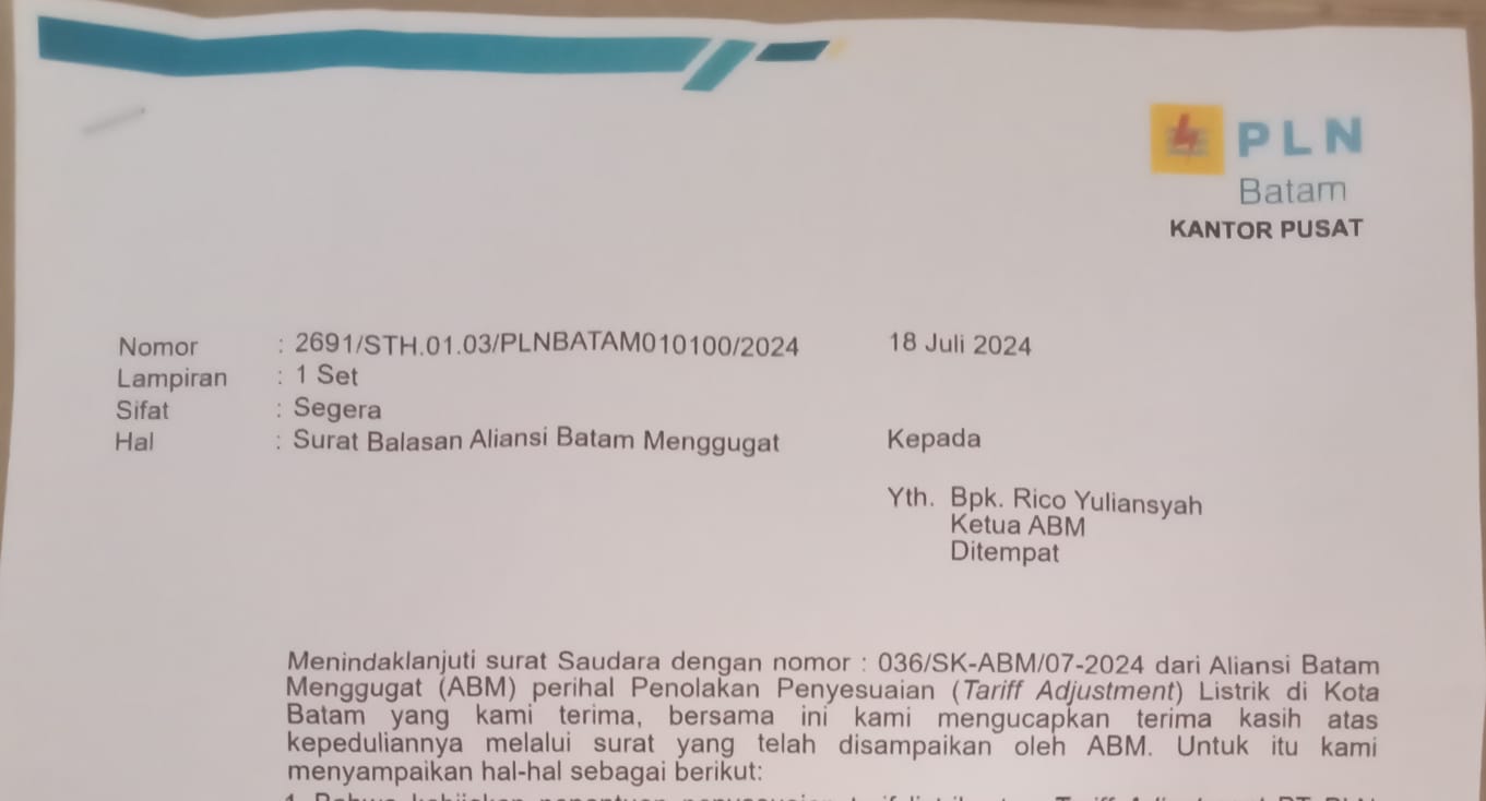 Surat jawaban (balasan) dari PT. PLN Batam dengan nomor 2691/STH.01.03/PLNBATAM010100/2024 tertanggal 18 Juli 2024 yang ditanda tangani langsung oleh Sekretaris Perusahaan (Sekper) PT. PLN Batam, Zulhamdi.