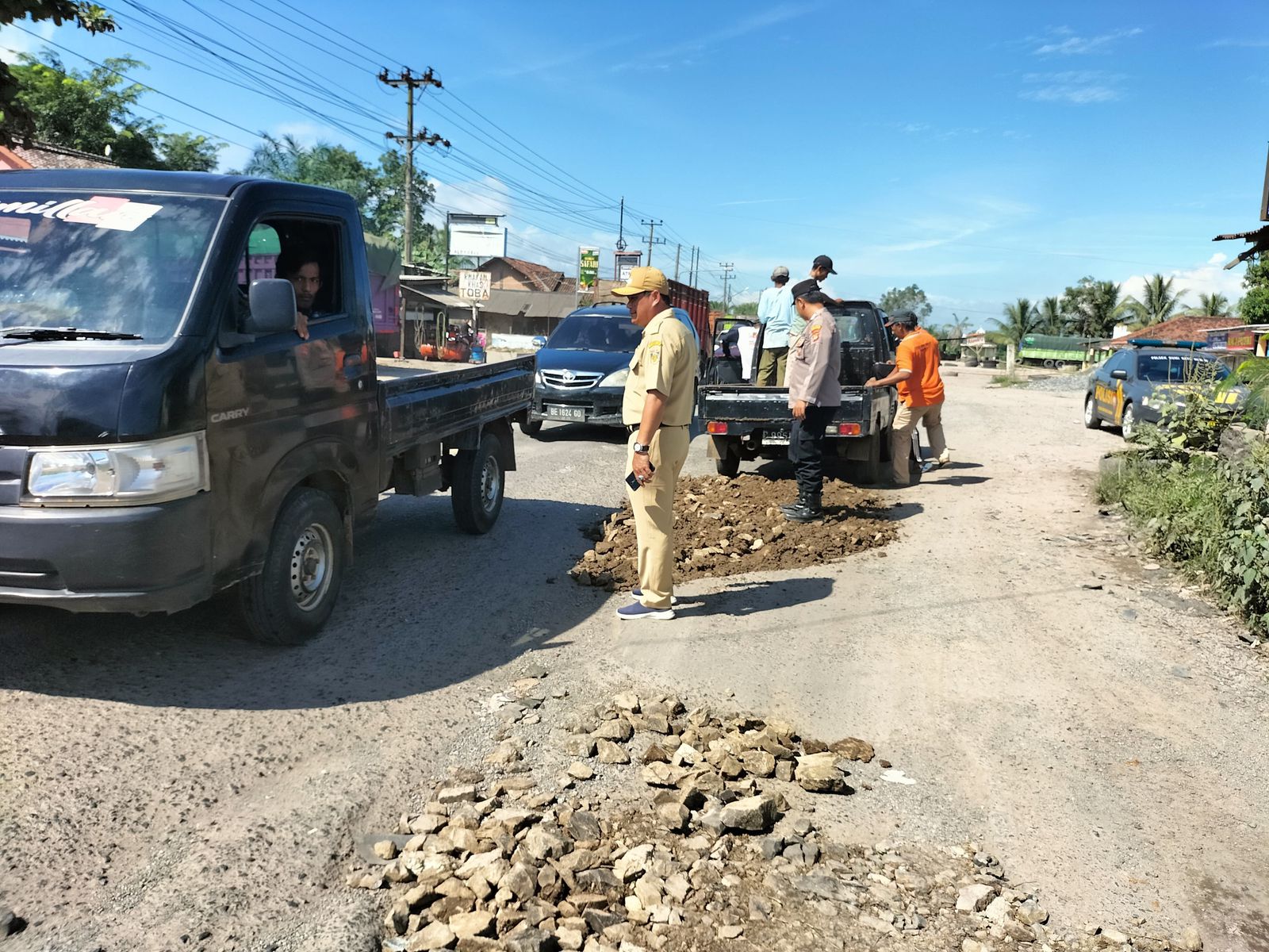 Di tengah teriknya matahari, mereka turun langsung ke lapangan untuk memperbaiki jalan yang selama ini menjadi keluhan masyarakat dan kerap membahayakan pengendara yang melintas.