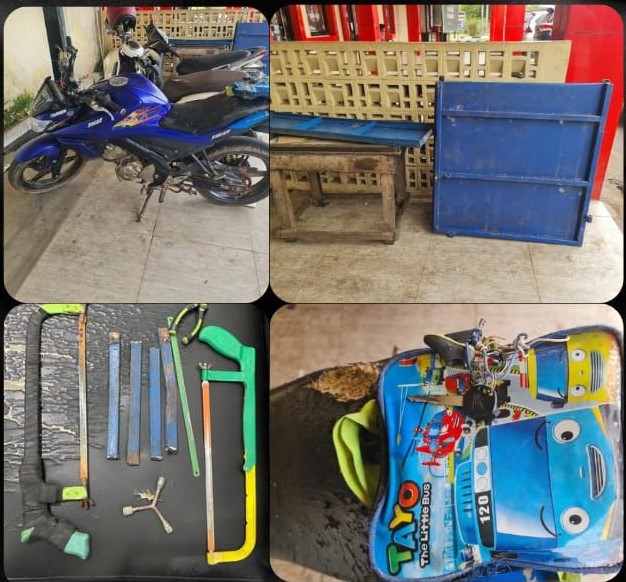 Setelah diamankan pelaku langsung di bawa ke Mapolres Banyuasin untuk dilakukan pemeriksaan lebih lanjut. Barang bukti yang disita dari tangan pelaku AFO berupa 3 buah gergaji besi 4 batang potongan besi warna biru.