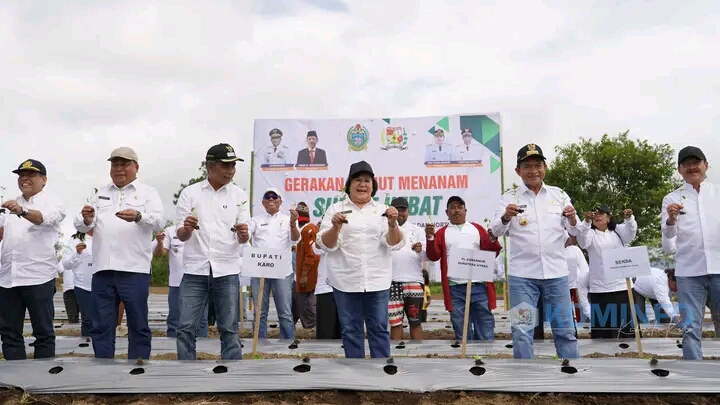 Bupati Karo, Cory Sriwaty Sebayang bersama Pj.Gubernur Sumatera Utara, Hasanuddin lakukan Gerakan Sumut Menanam Sekaligus Pemberian Bantuan kepada Kelompok Tani melalui Dinas Ketahanan Pangan, Tanaman Pangan, dan Hortikultura Provinsi Sumatera Utara bertempat di Desa Sampun Kecamatan Dolat Rayat, Kabupaten Karo, Selasa (16/01/2024).
