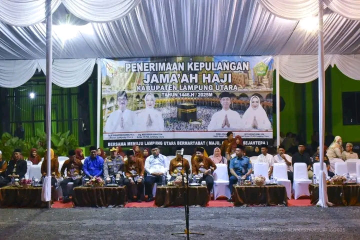 Kotabumi-Kompas86.com Bupati Lampung Utara, Dr.Ir.H.Hamartoni Ahadis, M.Si., menyambut langsung kepulangan jamaah haji Kabupaten Lampung Utara tahun 1446 Hijriah/2025 Masehi yang tergabung dalam Kloter JKG 15. Acara penyambutan berlangsung di Halaman Masjid Islamic Center Kotabumi, pada Senin malam, 16 Juni 2025, pukul 22.30 WIB.