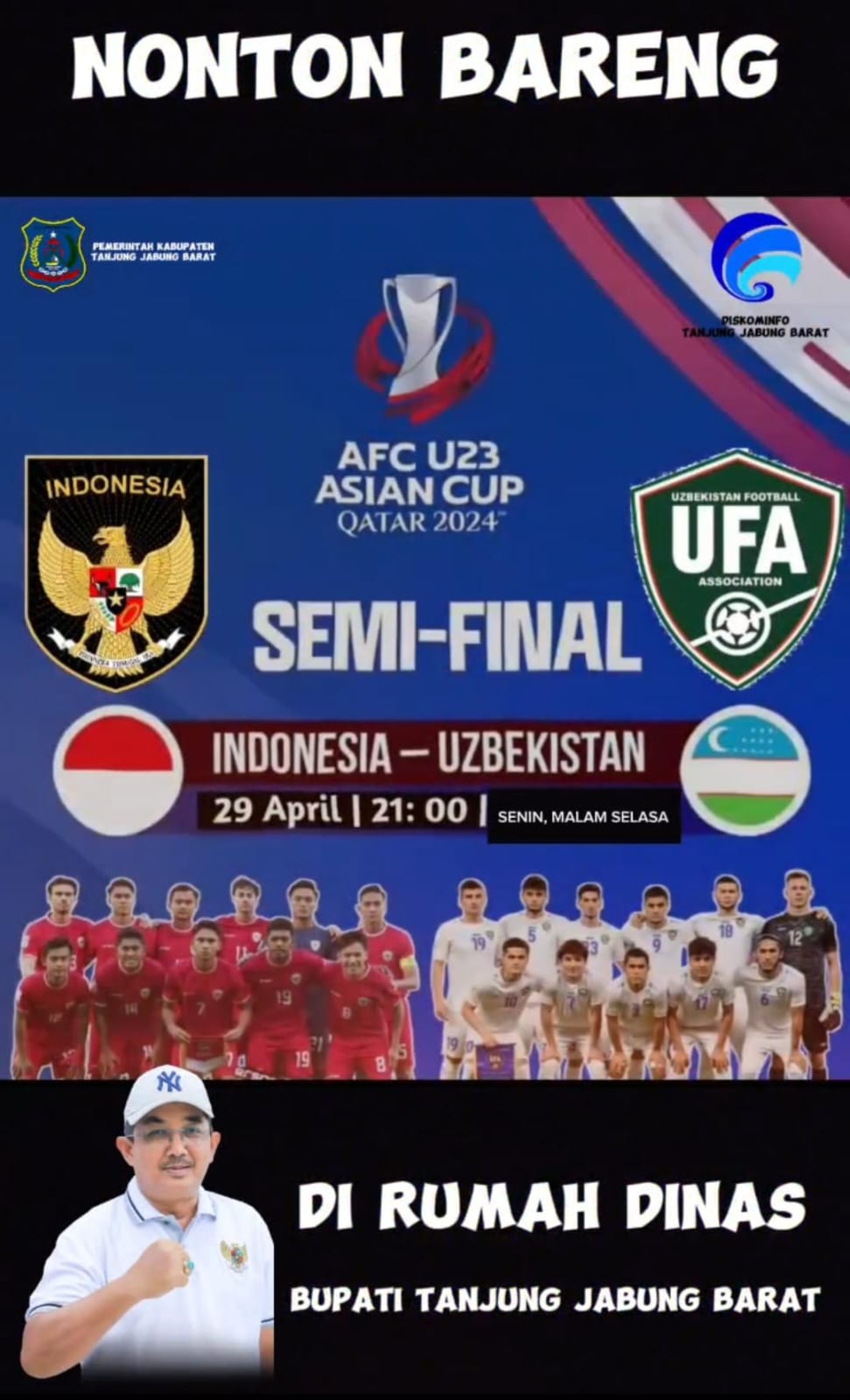 Sebagai bentuk dukungan atas langkah Timnas Indonesia U-23 di semifinal Piala Asia 2024, Bupati Tanjab Barat H. Anwar Sadat adakan nonton bareng (nobar) laga Timnas lawan Uzbekistan pada hari senin, 29 April 2024 jam 21:00 WIB di Rumah Dinas Bupati.