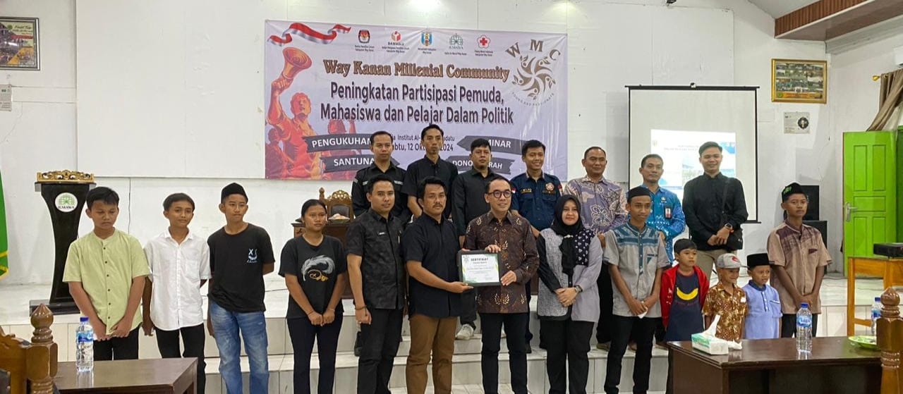Bupati way kanan H.Raden Adipati Surya S.H,M.M Mengukuhkan (WMC) Way kanan Millenial Community dan Seminar Peningkatkan partisipasi pemuda dalam politik, serta pula menggelar santunan anak yatim. Acara Kegiatan ini dilaksanakan di GSG Kampus Institut Al-Ma’arif (ILAMAWA) Baradatu Way Kanan hari sabtu 12 Oktober 2024pukul 13:00 WIB.
