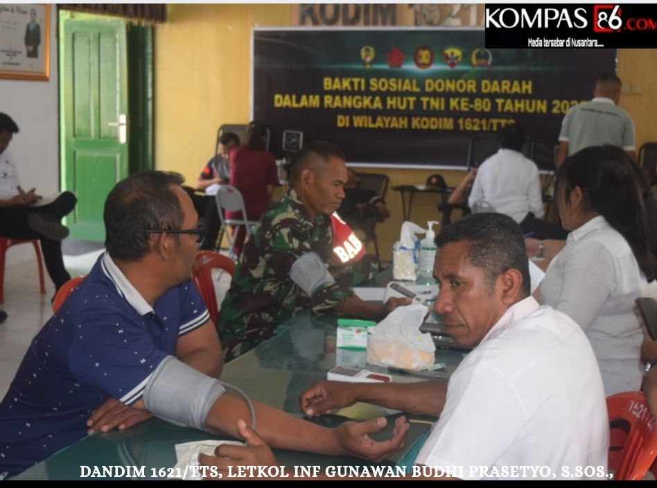 Kompas86.com – SOE, Dalam rangka memperingati HUT TNI ke-108, Kodim 1621/TTS menyelenggarakan kegiatan bakti sosial donor darah yang berlangsung di Aula Kodim 1621/TTS, Jl. Gajah Mada, Kelurahan Cendana, Kecamatan Kota SoE, Kabupaten Timor Tengah Selatan, Provinsi Nusa Tenggara Timur Selasa (24/09/2025).
