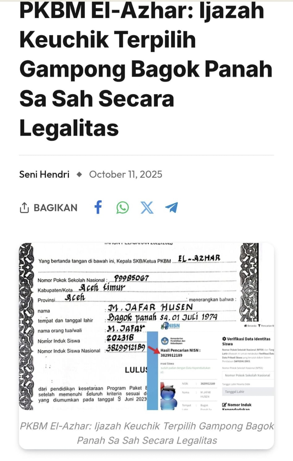 Aceh Timur – Kompas86.com___, 12 Oktober 2025, Perdebatan publik mengenai keabsahan ijazah Keuchik terpilih Gampong Bagok Panah Sa, Kecamatan Darul Aman, Aceh Timur, kini memasuki babak baru. Setelah sebelumnya muncul pemberitaan yang menyebut ijazah calon terpilih M. Jafar Husen diduga tidak asli, pihak PKBM El-Azhar selaku lembaga penerbit ijazah akhirnya angkat bicara dan membantah tudingan tersebut.