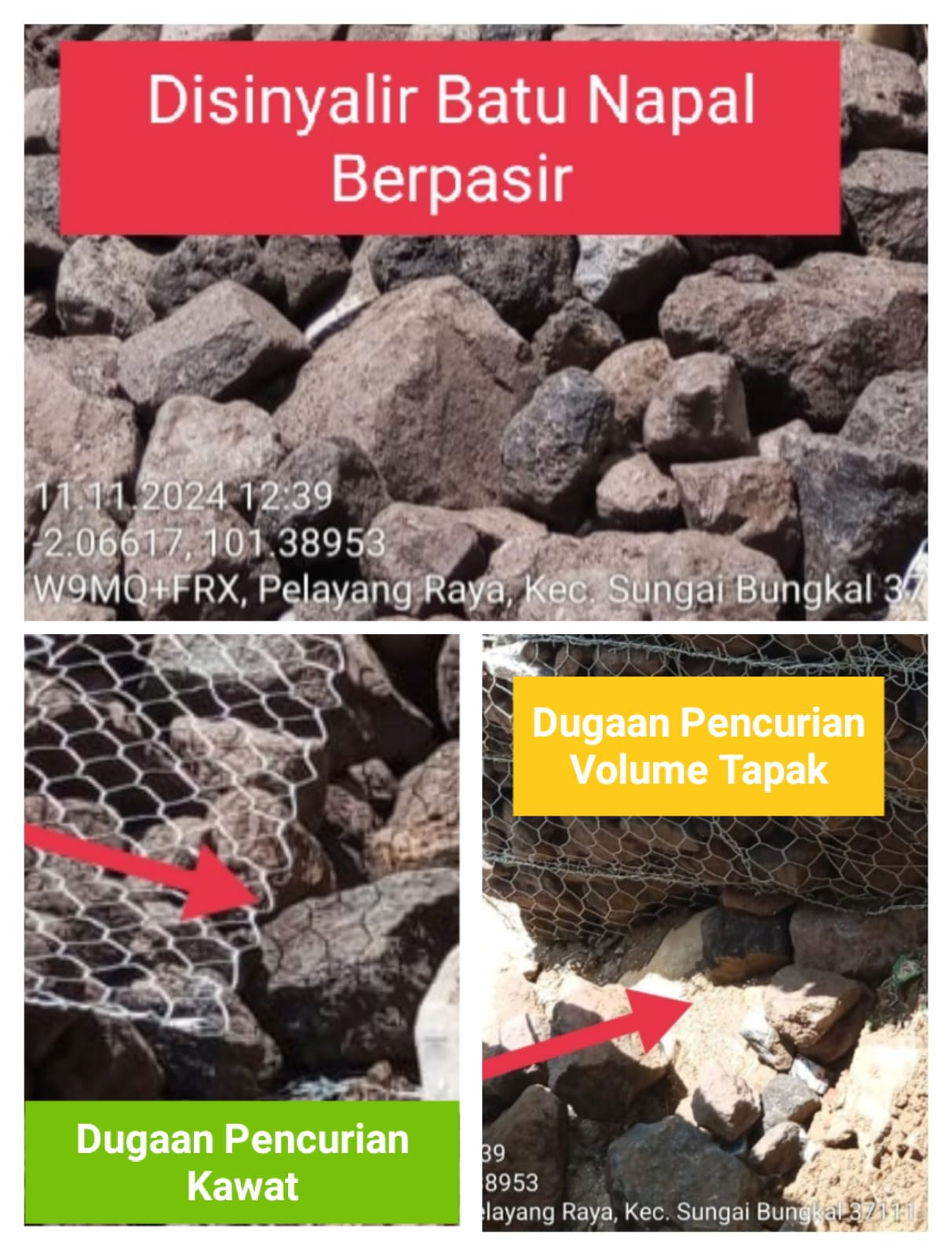 Fakta dugaan investigasi lapangan media ini, sesuai dokumentasi adanya sarat Korupsi, Kolusi dan Nepotisme dalam pelaksanaan kegiatan plbronjong penahan tebing sungai Bungkal desa Pelayang Raya.