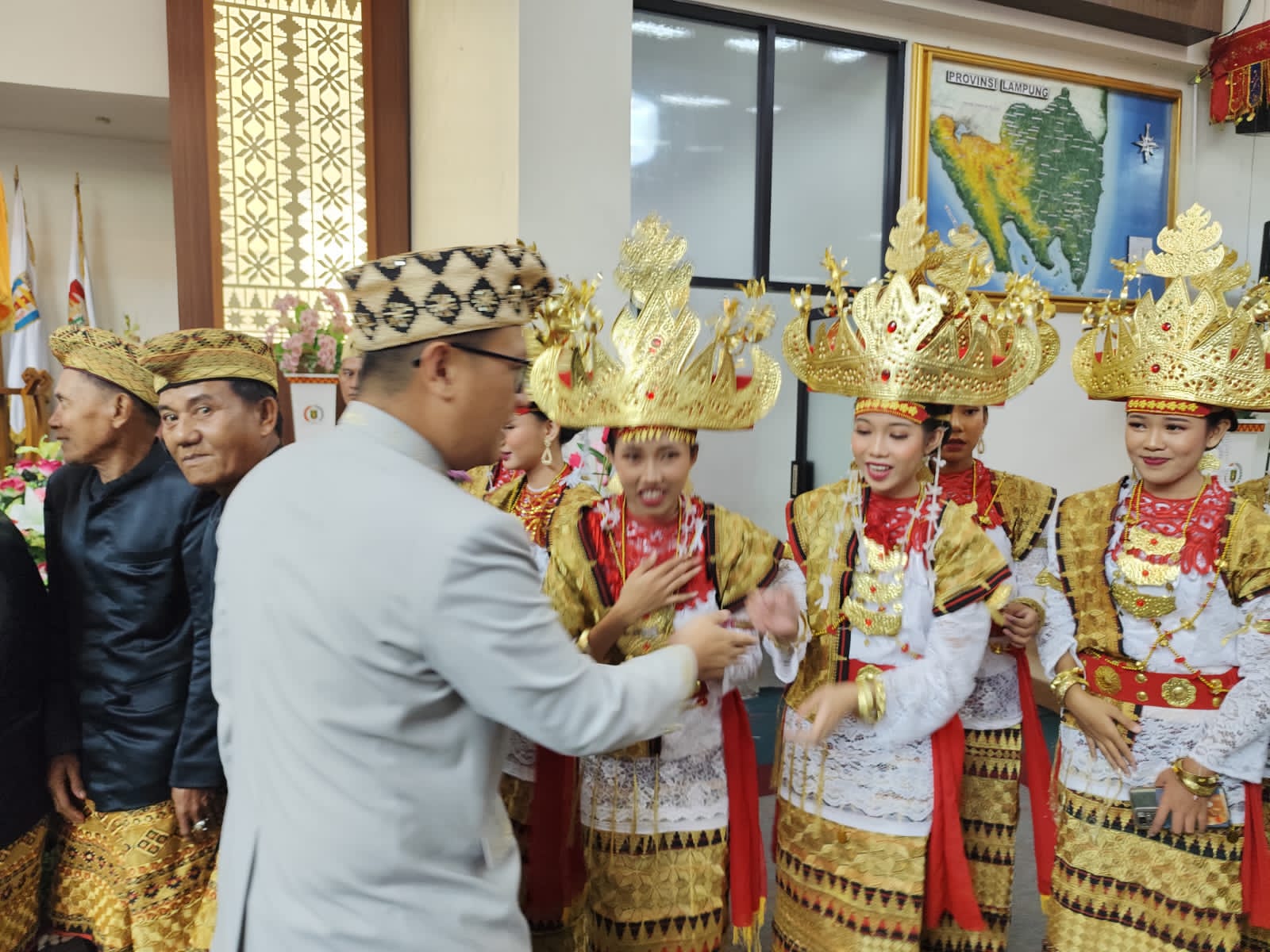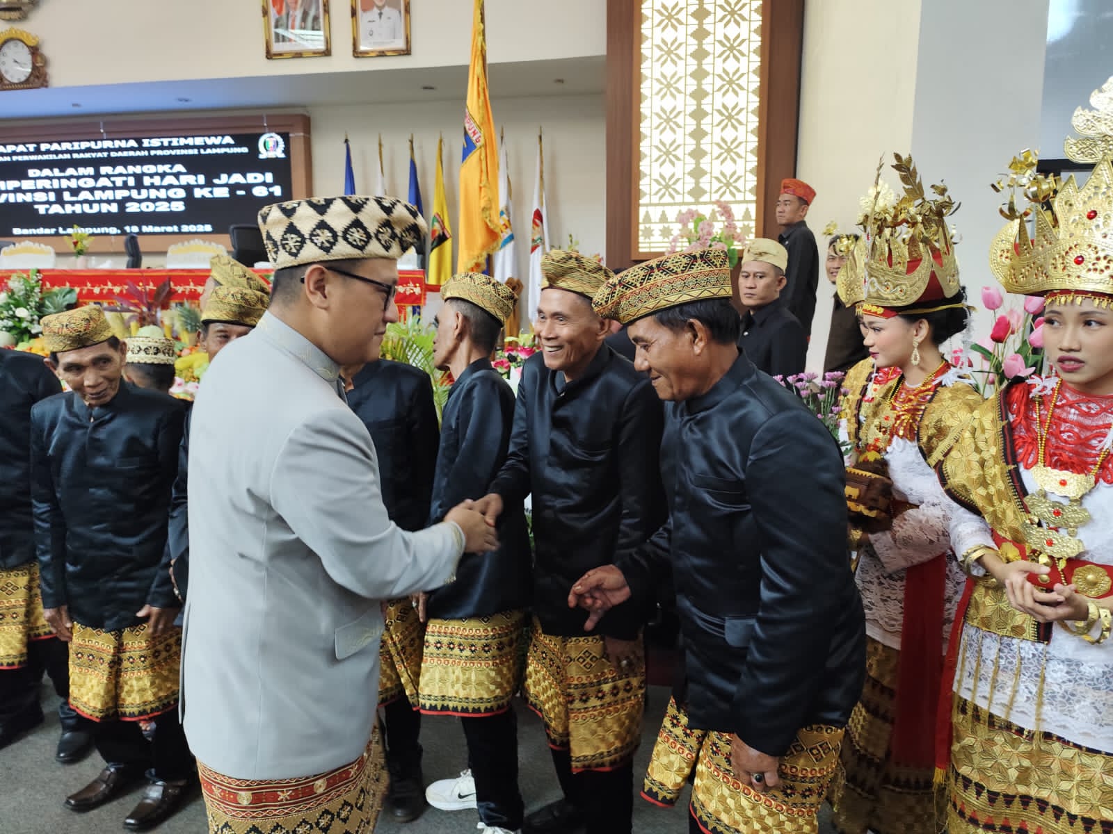KOMPAS86.COM, Bandar LampungV- Dalam rangka memeriahkan Hari Ulang Tahun (HUT) ke-61 Provinsi Lampung, Grup Sanggar Talo Balak Desa Negara Batin turut ambil bagian dalam acara puncak perayaan yang digelar di Gedung DPRD Provinsi Lampung, Selasa 18 Maret 2025. Acara ini dihadiri langsung oleh Gubernur Lampung terpilih, Bapak Rahmat Mirzani Djausal, Wakil Gubernur Lampung, Ibu Jihan Nurlela, Ketua DPRD Provinsi Lampung, Kiyai Giri Akbar, serta jajaran Forkopimda Provinsi Lampung. Turut hadir pula anggota DPRD Kabupaten Lampung Timur, Kiyai Solihin, yang merupakan putra asli Desa Negara Batin, Jabung Selasa (18/03/2025).