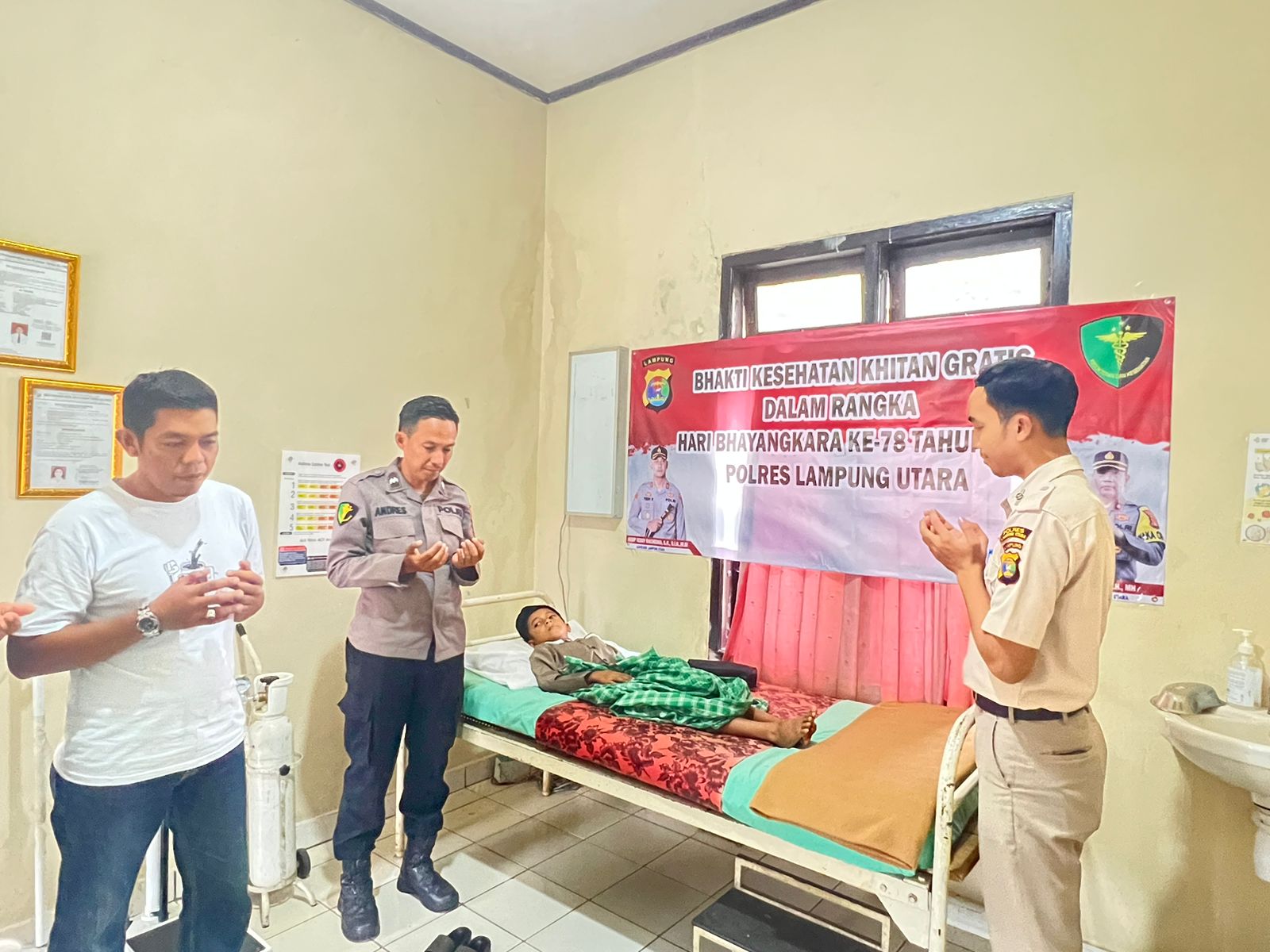 Kapolres Lampung Utara AKBP Teddy Rachesna, S.H., S.I.K., M.Si. mengatakan, hari ini kita mengadakan khitanan gratis yang mana kegiatan ini kita adakan dalam rangka memperingati Hari Bhayangkara ke-78 serta bentuk sosial dan kepedulian kami kepada warga.