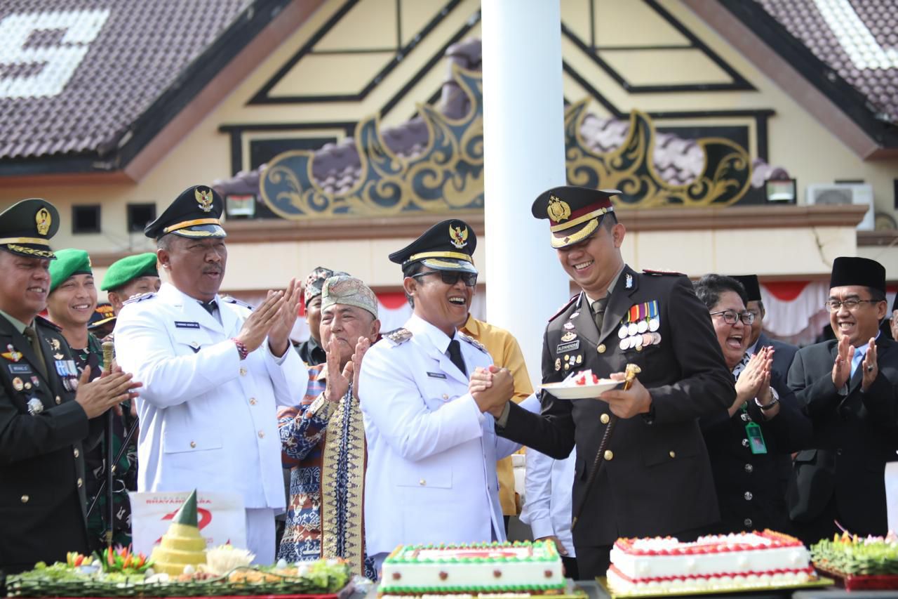 Kejutan tersebut berupa pemberian kue ulang tahun dan nasi tumpeng yang diserahkan langsung oleh Bupati Lampung Tengah, Ardito Wijaya didampingi Wakil Bupati, I Komang Koheri, Ketua DPRD atau yang mewakili, Dandim 0411/KM, Kajari, Kepala Pengadilan Negeri, serta para pejabat daerah dan tokoh masyarakat lainnya.