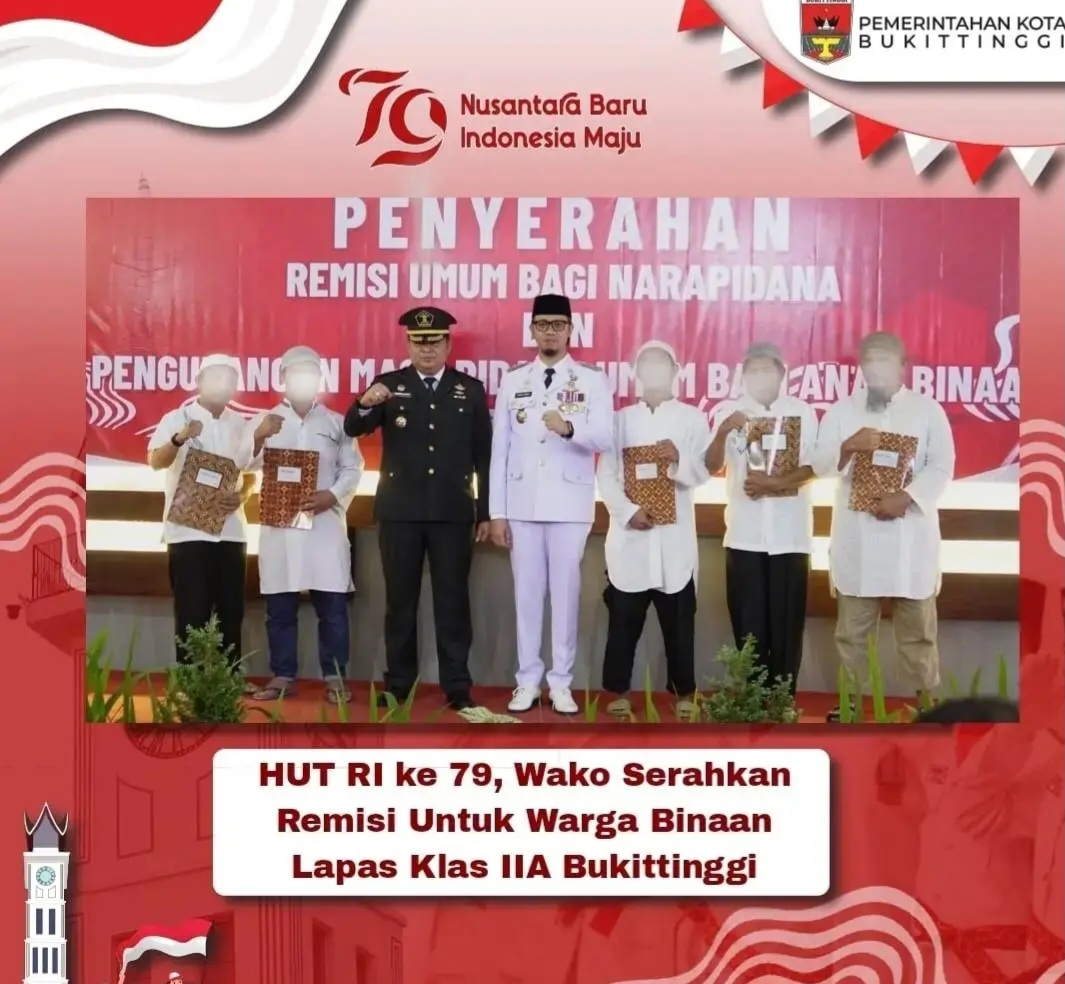 Kepala Lapas Klas II A Bukittinggi, Herdianto, menjelaskan, dalam rangka Hari Kemerdekaan Indonesia ke 79, pihaknya mengajukan remisi umum bagi narapidana dan anak sebanyak 327 Setelah diproses, semua yang diajukan mendapat remisi dan 1 diantaranya mendapatkan remisi belum bebas masih menjalankan subsidier.