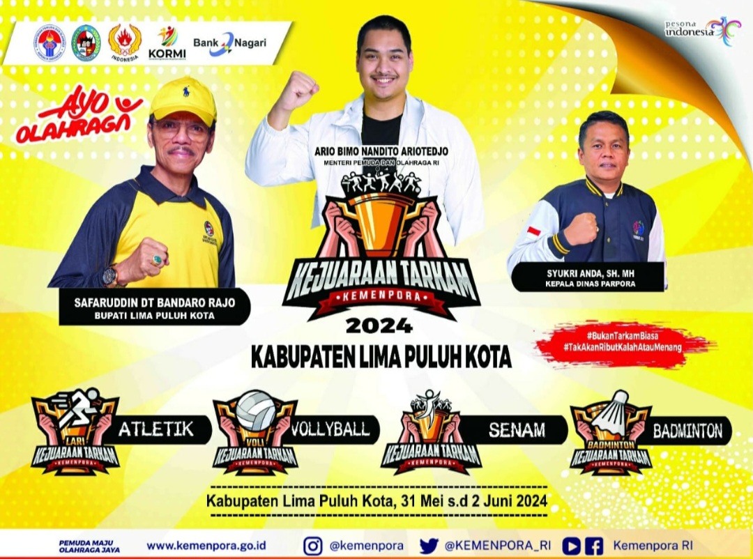 50 KOTA (SUMBAR) KOMPAS86.com – Empat cabang olahraga yang di perlombakan pada kejuaraan liga Tarkam tahun 2024, sesuai dengan SK Deputi Pemberdayaan olahraga tentang penunjukan Kabupaten / Kota penyelenggara Liga Tarkam 2024 yang merujuk kepada Instruksi Presiden nomor 1 tahun 2017 tentang Gerakan Masyarakat Hidup Sehat ( Germas ).